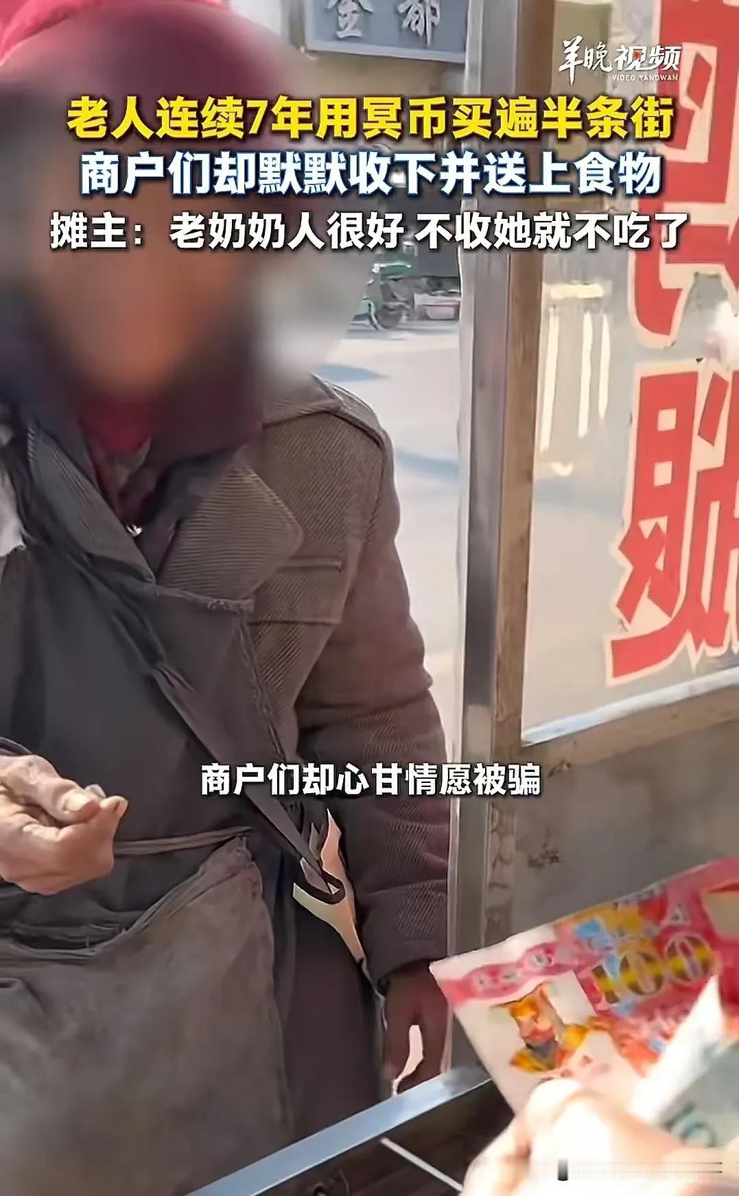 真的看破防了——这哪里是收冥币,这是一群普通人,用最温柔的方式,守着一位老人的温饱与体面。 不是惊天动地的善举,就是街头最朴素的人心: - 老人拿“钱”来,大家就笑着收下 - 不戳破、不嫌弃、不议论 - 默默配合,一演就是7年 他们说:不收钱,她就不吃。 一句话,道尽底层百姓最柔软的善良。 穷不丢良心,苦不欺弱小。 这些摊主没什么豪言壮语,却用日复一日的包容,告诉我们: 人间最暖的光,往往就亮在最普通的市井里。 素材来源于网络