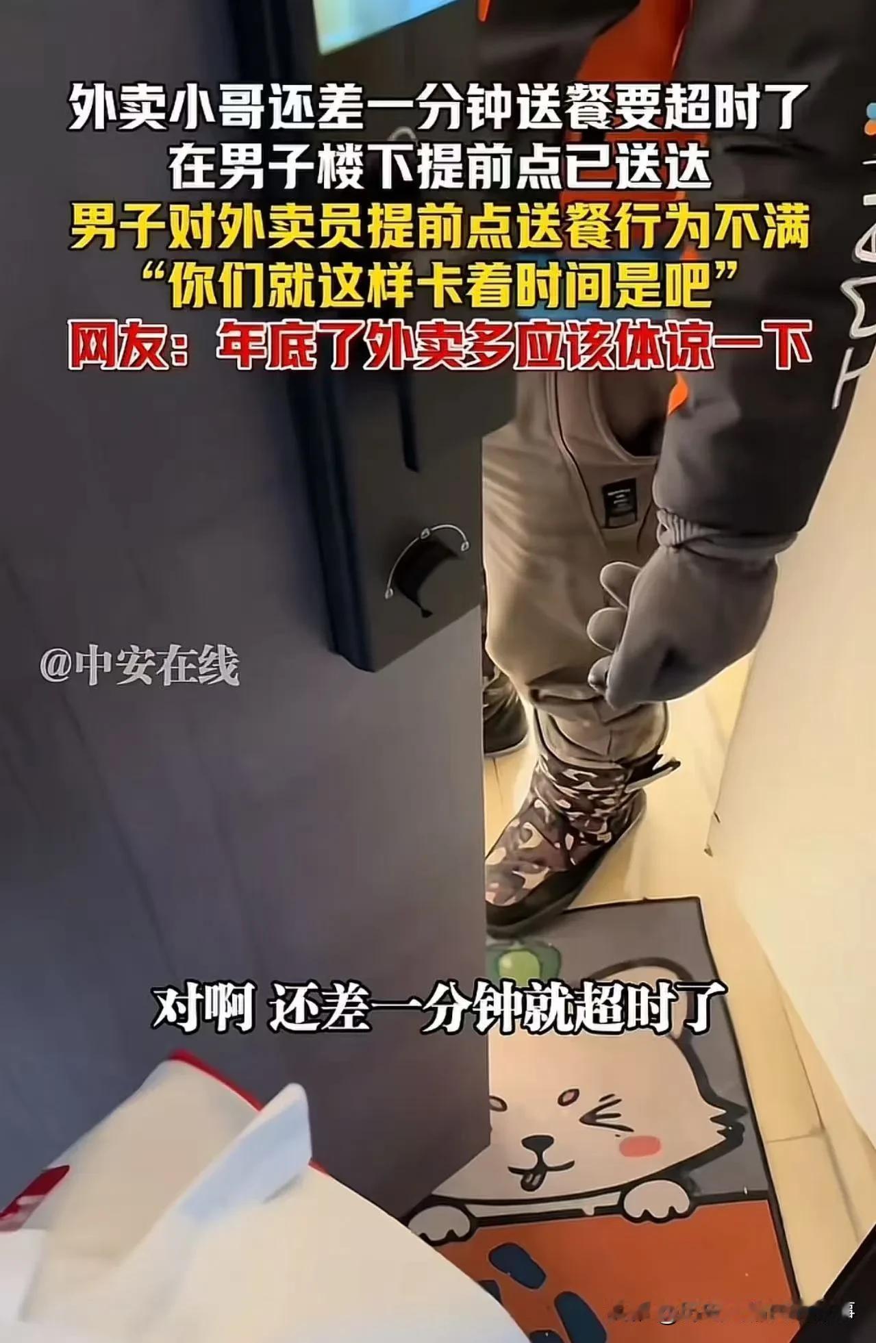 这一幕真的太扎心了——一边是为了几块钱拼命跑、怕超时扣钱的慌张,一边是守着规则、毫不让步的较真,两种生活的重量撞在一起,谁都不容易,却又谁都难共情。 外卖小哥那句态度,之所以让全网破防,无非是大家都看懂了: - 他不是故意违规,是真的赶不上、真的怕扣钱 - 他低声下气、拼命解释,不是认输,是被生活压得抬不起头 - 顾客也没错,他只是想要准时的服务、守自己的道理 可最让人难受的是: 两个人都没做错什么,却偏偏要在一分钟里,分出谁更委屈。 网友炸锅,不是骂谁对谁错,是心疼—— 心疼每一个在时间线上狂奔、不敢出错、不敢迟到的普通人。 愿多一点体谅: 你守你的规矩,我懂我的不易, 少一句质问,多一句**“没事,我等你”**, 素材来源于网络