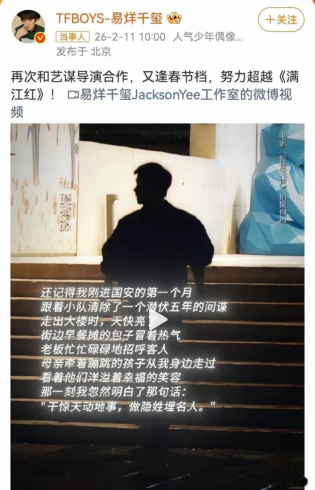 不敢相信这是易烊千玺本人发的…印象中他是个情商蛮高的艺人,今天发的微博“努力超越满江红”实在让人费解,已知《满江红》一番是沈腾,票房破30亿。其他主演有易烊千玺、雷佳音和张译。《惊蛰无声》一番男主是易烊千玺,其他主演有雷佳音、张译和朱一龙等。两部电影的导演都是张艺谋,易烊千玺说要超越《满江红》是何意味,是想超越之前的自己,还是想超越沈腾呢?