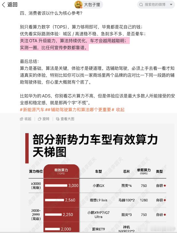 所以我的建议:算力优先,体验为辅。优先选择算力高的,潜力更大。车企的算法水平不太可能持续存在代差,一家车企的算法上的领先可能也就小半年,就会被绝大多数辅助驾驶团队赶上。