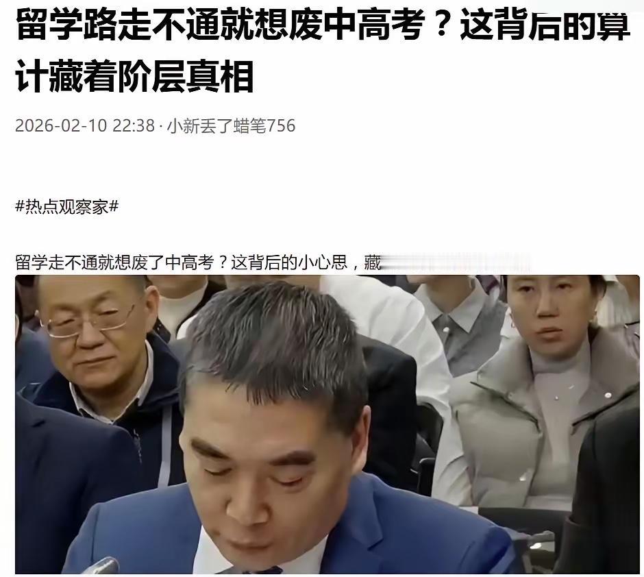 一直想不通的是,为什么在2026年初这个时间点,有人突然提出取消中高考,原来是牢A把留学的光环给彻底搞熄火了,既然留学这条绕开高考的“镀金捷径”走不通了,那这群人就把主意打到了高考身上,把公平公正公开的高考,批得一无是处,指责唯分数论,扼杀创新等等,想学着美国搞推荐信制度,这样有钱有权的人的小孩,就可以通过各种手段,堂而皇之地进入大学。 正像有人说的那样,守护中高考的公平,就是守护每一个普通人的努力,就是守护这个社会的根基和未来。说白了,这些声音听着很“高级”,讲的都是素质教育、综合评价、个性发展,包装得挺好看,拆开一看,核心诉求就一个字:绕。绕开那条对所有人一视同仁的独木桥,给自己孩子多修几条“后门通道”。高考难不难?难。中考卷不卷?卷。可再难再卷,起码规则摆在明面上,分数高低一目了然,不看你家里几套房,不问你爸妈啥身份。 很多普通家庭的孩子,唯一能抓住的机会,就是这场考试。白天上课,晚上刷题,寒暑假补课,拼的就是一口气。有人嫌它“唯分数论”,可对底子薄、资源少的人来说,分数恰恰是最干净的尺子。把这把尺子掰断,换成推荐信、背景材料、竞赛包装,最先被挤出局的,永远是没关系、没资源的那拨孩子。 再看看那些被吹上天的“多元评价”。谁来评?怎么评?标准是谁定?这些问题一旦落到现实里,很容易就变成“谁声音大谁有理”。写推荐信的老师,手里握着不小的话语权;包装材料的中介,明码标价;所谓的综合素质,拼的是家庭投入。普通人家,连请个专业老师都费劲,更别提搞一堆花里胡哨的履历。 高考不完美,这话不假。题目设置、区域差异、教育资源分布,哪一样都能挑出毛病。可不完美不等于该推倒。推倒之后换来的,是一套更不透明的规则。到那时,努力读书反而成了“老实人吃亏”。对很多孩子来说,书本是唯一能翻身的工具。把这个工具拿走,等于告诉他们,出身比努力更重要。 守住中高考的公平,不是替考试洗白,是给普通人留条路。你可以讨论怎么改进命题,怎么缩小差距,怎么让课堂更有活力,这些都是正经事。可要是奔着拆掉公平底座去,那就不是教育讨论,是利益博弈。谁能从中受益,谁会被挤到角落里,答案其实挺清楚。 社会的地基,靠的不是少数人的“通关秘籍”,而是大多数人对规则的信任。只要规则还在,普通人就愿意咬牙往前跑。一旦规则变得看不懂、摸不着,跑得再快也可能被一脚踢下赛道。