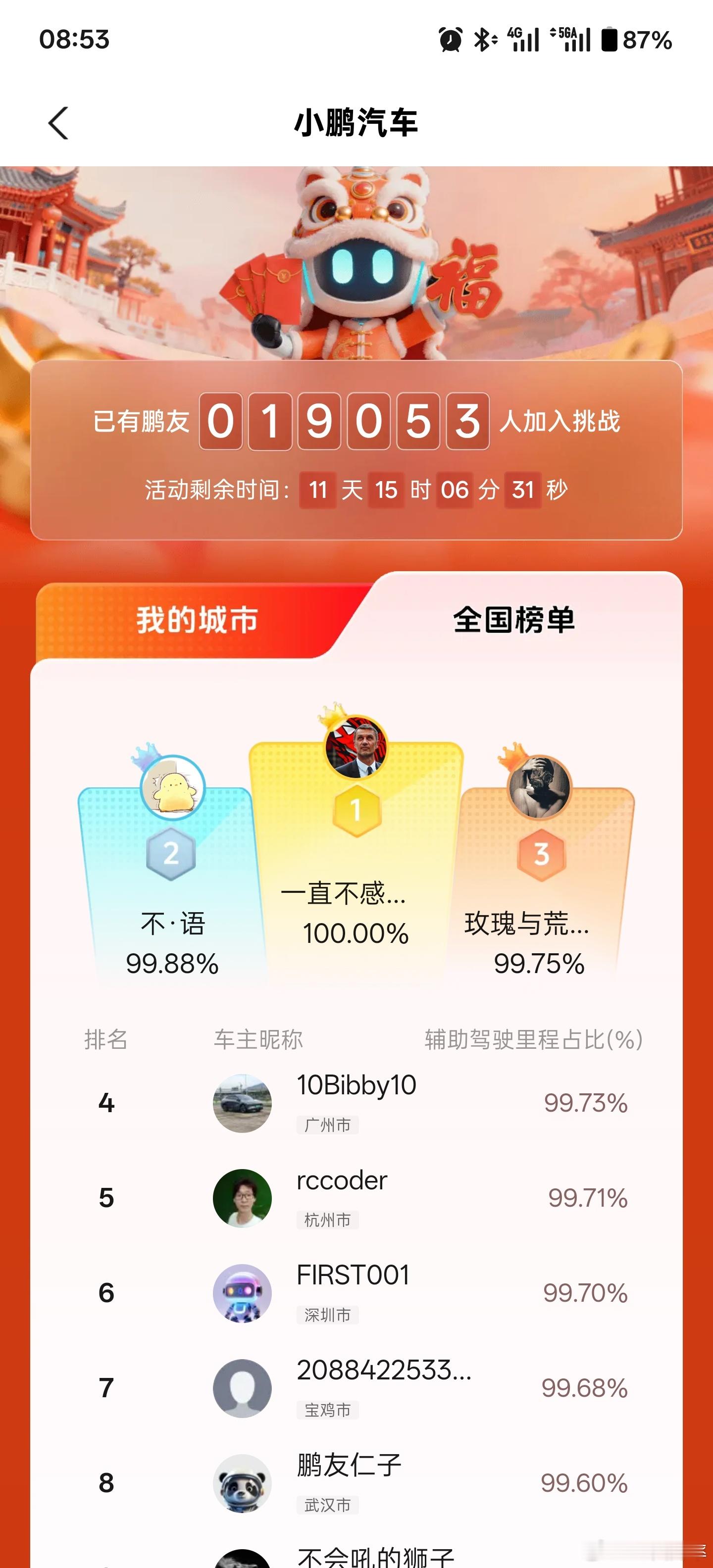 小鹏汽车 开启的NGP冲榜活动,又让各个群里早上都活跃在对比排名的氛围里了不过我觉得如果有里程数+比例两个维度的排名就好了,往年只有里程数,今年又只有比例
