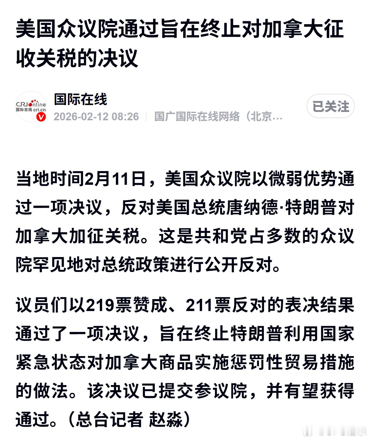 美国众议院通过旨在终止对加拿大征收关税的决议