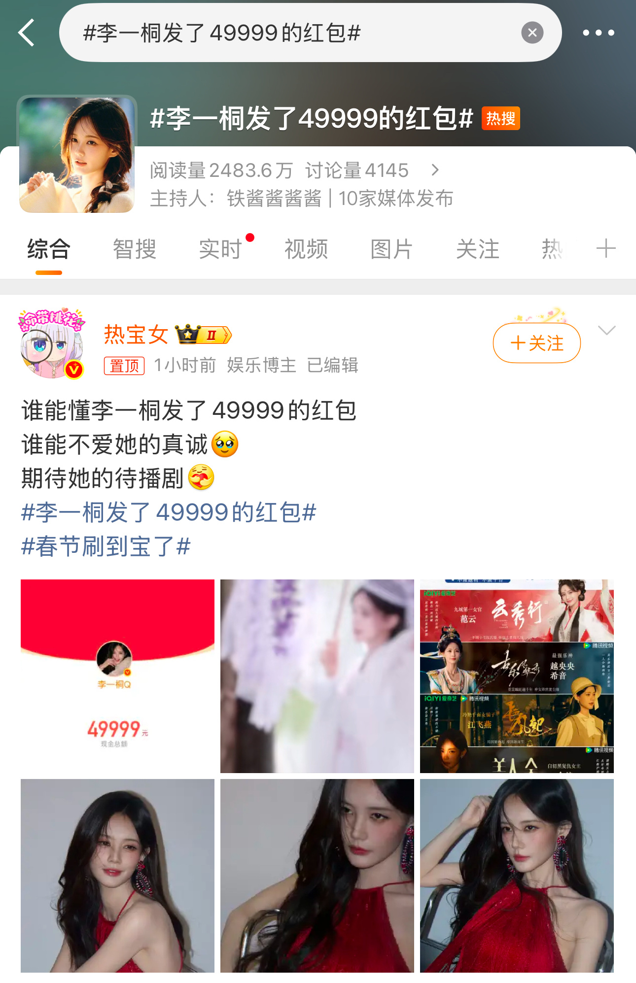 昨天刷到的还是李一桐假唱今天就刷到她在自己微博发了49999的红包有热度对明星来说确实是好事……