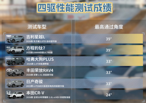 奇骏 e-POWER 动力爆发直接,20 度坡起干脆利落;星越 L 轮间限滑介入果断,制动分配精准;大狗 PLUS 凭后桥差速锁几乎不打滑完成爬坡。CR-V 全程可控,RAV4 稳但偏慢,而钛 7 多次需要“找抓地力”,差距一目了然。