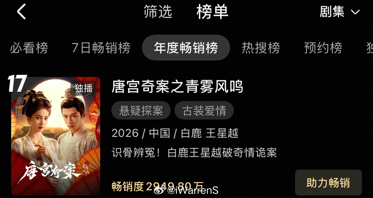 白鹿新剧唐宫奇案之青雾风鸣👖站内拉新年榜第17名了呀!这也太快了吧!🔥相比去年白鹿没有那么紧张了