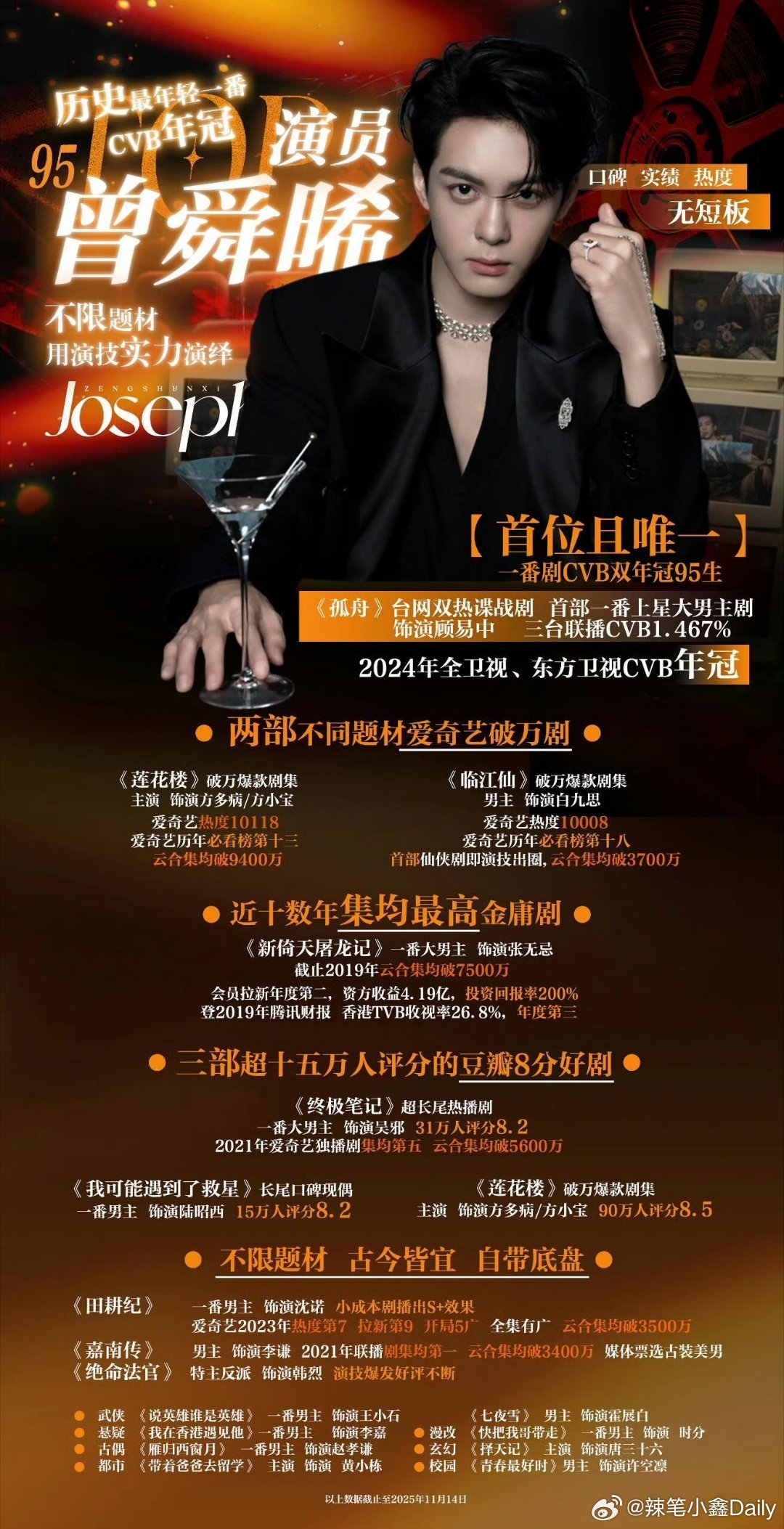 曾舜晞昨天发的新歌《浆果》登上飙升榜No.1,小曾做演员做歌手都很精彩!