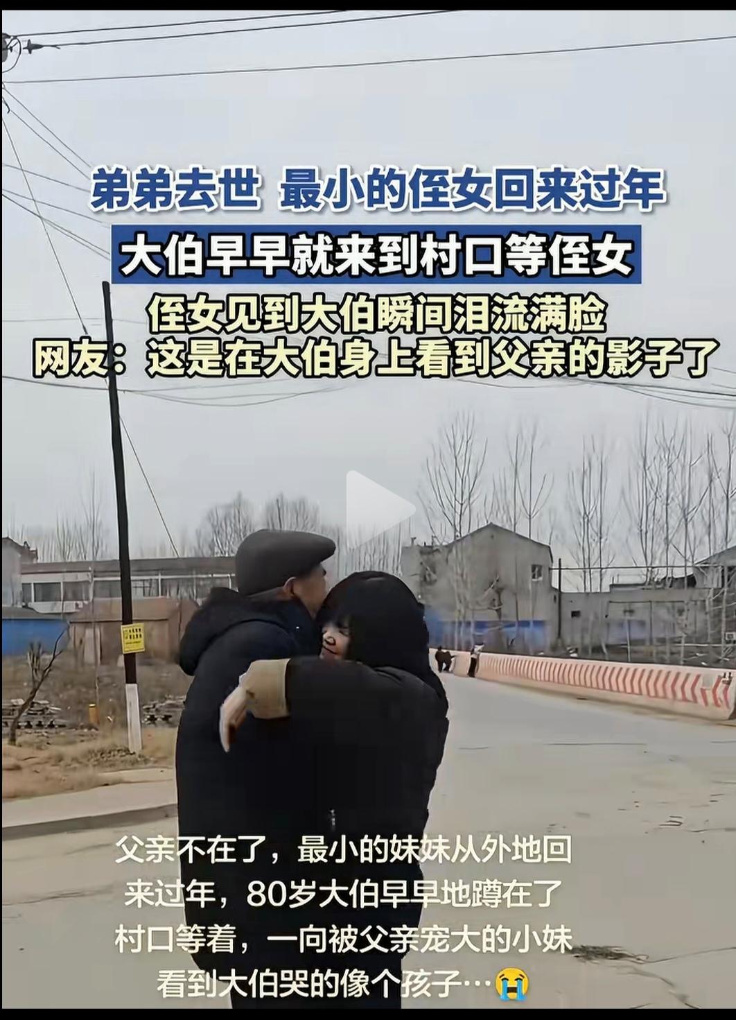 刚刚看到抖音、头条一个短视频,催人泪下:一位80多岁的大伯因为弟弟已经去世了,最小的侄女回到老家过年,他就像他的弟弟当年一样,骑着三轮车去村口等侄女,侄女看到80多岁的大伯在村口等自己,就好像当年自己的父亲等自己一样,忍不住上前拥抱大伯,两人相拥而泣! 侄女看到大伯肯定想到了自己的父亲,大伯看到最小的侄女,想起了自己的弟弟!这是一种亲情,这也是一种回家的意义! 我的父亲过完春节就92周岁了,2025年上半年,我的叔叔81岁,因病逝世,在老家祠堂做礼仪的时候,我的父亲找我们兄弟的搀扶之下,颤颤悠悠去看弟弟最后一面,我的父亲自己都很难一个人独立走路,完全是驼着背颤颤抖抖走路。叔叔的两个外嫁的女儿,看到颤颤悠悠的大伯父来看他们的父亲最后一面,突然之间大哭起来,跪在大伯父的面前,抱着的我父亲的两条骨瘦如柴的腿大哭。 我的两个堂姐看到我的老父亲,应该就看到他们的父亲一样,她们再也没有了爸爸。 我的父亲比叔叔大十岁,在我父亲19岁的时候,我的爷爷就走了,我的父亲不但要养活自己,还要照顾年幼9岁的弟弟,跟奶奶三个人相依为命,我的父亲不但要自己赚钱娶老婆结婚,后来还给叔叔娶老婆结婚,所以一辈子的前半生过的是相当贫穷,相当艰巨!在农村里面,贫穷的家庭要娶老婆是相当困难! 等到我们兄弟长大条件才略微改善,特别是当我考上大学以后,我的父亲感觉就挺起了驼背,眼睛都开始有神,因为那个年90年代,如果农村考到大学,就意味着跳出了农门,有了铁饭碗,父亲开始有了自信,充满了骄傲,不再自卑。 我大学毕业以后,我的父母基本上在经济上已经没有负担,虽然不算大富大贵,但最起码不会像以前一样为了钱而再去干繁重的体力活。农村的活他们可以干,也可以不干,只是当做一种习惯,偶尔干一些力所能及的体力活,再也不像前半辈子一样为了赚钱而拼命的干繁重的体力活! 我记得93年我上高二的暑假,我跟父亲上山去砍柴,最重的一次,他一个人挑了210斤,我挑了160斤,从山上下到公路旁边售卖,为了生活,为了我的学费,两个人腿都是颤抖着走,那个时候100斤柴可以卖8块钱。 我现在可能80斤也挑不起了![捂脸] 希望92岁的老父亲能够再多活几年,你85岁的老母亲吵吵闹闹,携子之手,与子偕老。 有时打电话给母亲,老母亲又牢骚,父亲在骂她,我心里在想,父亲90多岁了,还骂的动,这是好事![呲牙][捂脸] (图片来源网络。如有侵权,请联系删除)
