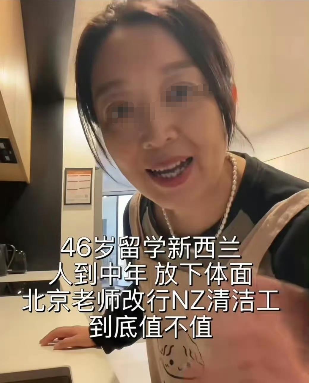 新版“拿的起放的下”。 (如图所示)北京一女老师,人到中年,选择去新西兰去留学,自称放下了体面,改做清洁工。这其实这是最佳的选择,初到异国,语言能力不行,做服务员、收银员等简单的工作都不能胜任,做清洁等体力活是无奈之选。