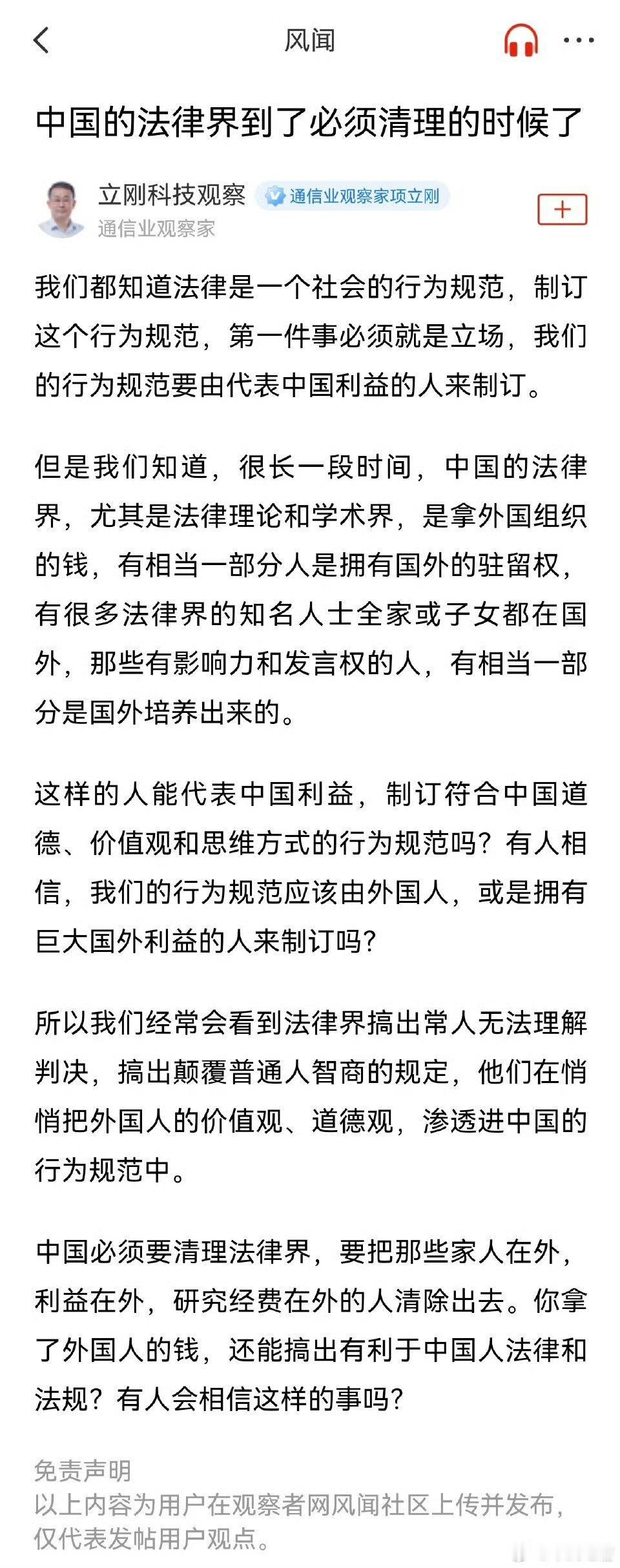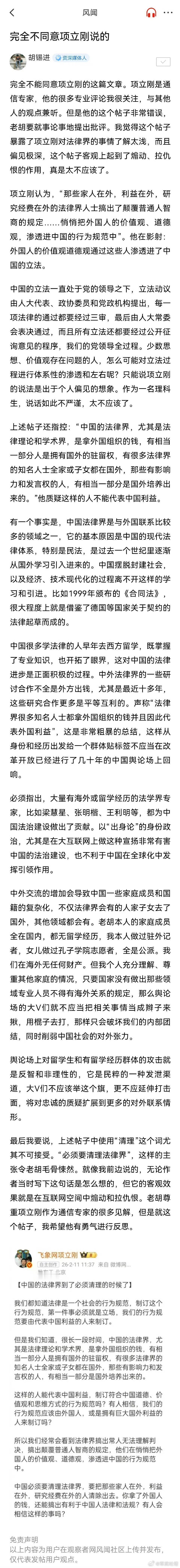 胡锡进又急了,不保持他的沉默权了。 项立刚说,要清理法律界,那些家人在国外,利益在国外,经费来自国外,自己却在国内的法律专家。 胡锡进这次不保持沉默了,立马第一时间跳出来反对,而且还把高度拔得很高,最主要的是,还悄无声息的偷换概念。 不过这也是胡锡进的惯用伎俩了。 别的不想说,只想问一句,胡锡进什么时候评论一下美国的斩杀线呢?