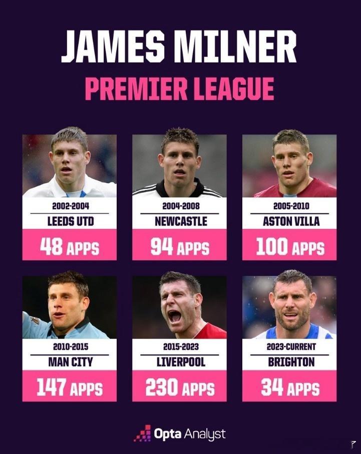 在本轮英超布莱顿0-1不敌维拉的比赛中,米尔纳替补登场,完成个人英超第653次出场,追平了巴里保持的英超历史出场纪录,以下为米尔纳英超生涯代表各球队出战场次分布: