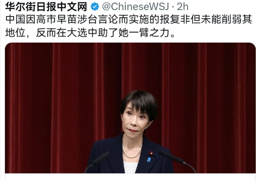 美媒表示,高市早苗的胜选,中国或许非常的沮丧!2月11日,美国华尔街日报刊文表示,几个月来,中国一直试图就日本首相高市早苗去年秋天有关台湾的言论对她进行“惩罚”;台湾是一个“自治岛屿”,中国政府已誓言必要时将以武力收复。在高市早苗表示若中国试图武力夺取台湾,日本可能被卷入冲突后,中国政府予以猛烈抨击,“威胁”进行经济报复,并“威慑”日本的安全。 说白了,华尔街日报说“高市早苗胜选,中国非常沮丧”,表面看是选举解读,实则是美式舆论刻意编造的谎言,更是为日本右翼扩军玩火站台的险恶算计。 要知道,2月11日美媒公然宣称,中国数月来试图“惩罚”高市早苗涉台言论,她胜选就让中方沮丧,还歪曲台湾是“自治岛屿”,这话配上事实,活像颠倒黑白的闹剧。 可这绝非客观分析,而是美媒典型的舆论操纵。中国从不干涉日本内政,对其选举结果毫无所谓沮丧可言,我们反对的,从来只是高市早苗极端右翼立场与粗暴干涉台海的言论,不是日本人民的选择,这种刻意抹黑,太险恶。 殊不知,高市早苗胜选根本吓不倒中国,反而让我们更加清醒。她上台就推动修宪扩军,鼓吹“台湾有事就是日本有事”,甚至公开为参拜靖国神社铺路,彻底抛弃战后和平底线,这种步步紧逼,只会让中国捍卫主权的决心更坚定。 而华尔街日报炒作“中国沮丧”,本质是在给日本右翼壮胆。美国想把日本绑在印太战车上,充当遏华马前卒,便故意把中方正当反制歪曲为“报复与威慑”,把日本危险路线包装成“勇敢对抗”。 更关键的是,高市早苗的胜利,真正危险的是日本自身。她一边大幅提高防卫开支,一边放松军事限制,把整个国家推向军备竞赛,却对民生债务视而不见,这种为政治私利赌上国家未来的做法,最终只会让日本民众付出代价。 要清楚,历史总是惊人相似。当年日本右翼政客无视战争罪责,对外冒险扩张,最终给亚洲与本国带来深重灾难;如今高市早苗重走老路,不思反省反而变本加厉,历史早已证明,逆流而动绝无好下场。 而未来,照这个趋势下去,高市早苗大概率会加速推动修宪、强化日美同盟、持续在台海问题上挑衅。中国必然采取更坚决措施捍卫核心利益,地区军事紧张会持续上升。关键转折点,就在日本是否彻底突破和平宪法底线,一旦越线,必将付出难以承受的代价。 说到底,所谓“中国沮丧”不过是美媒自欺欺人。中国从不畏惧任何挑衅,真正该沮丧的,是那些沉迷冷战、煽动对抗、妄图阻挡中国统一的势力。主权底线不容侵犯,历史大势不可逆转,谁玩火,谁就必自焚。 以上是小编个人看法,如果您也认同,麻烦点赞支持!有更好的见解也欢迎在评论区留言,方便大家一同探讨。