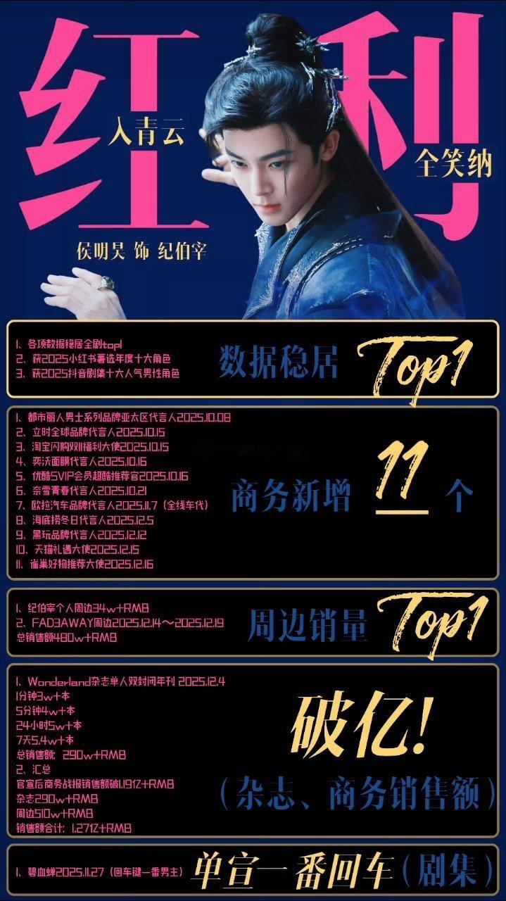 侯明昊是天花板级的有效播剧了吧?从入青云到现在马上要官宣第20个sw了,官方战报累计销售额破亿,有没有大爆吸粉吃到红利看sw和杂志是最直观的。