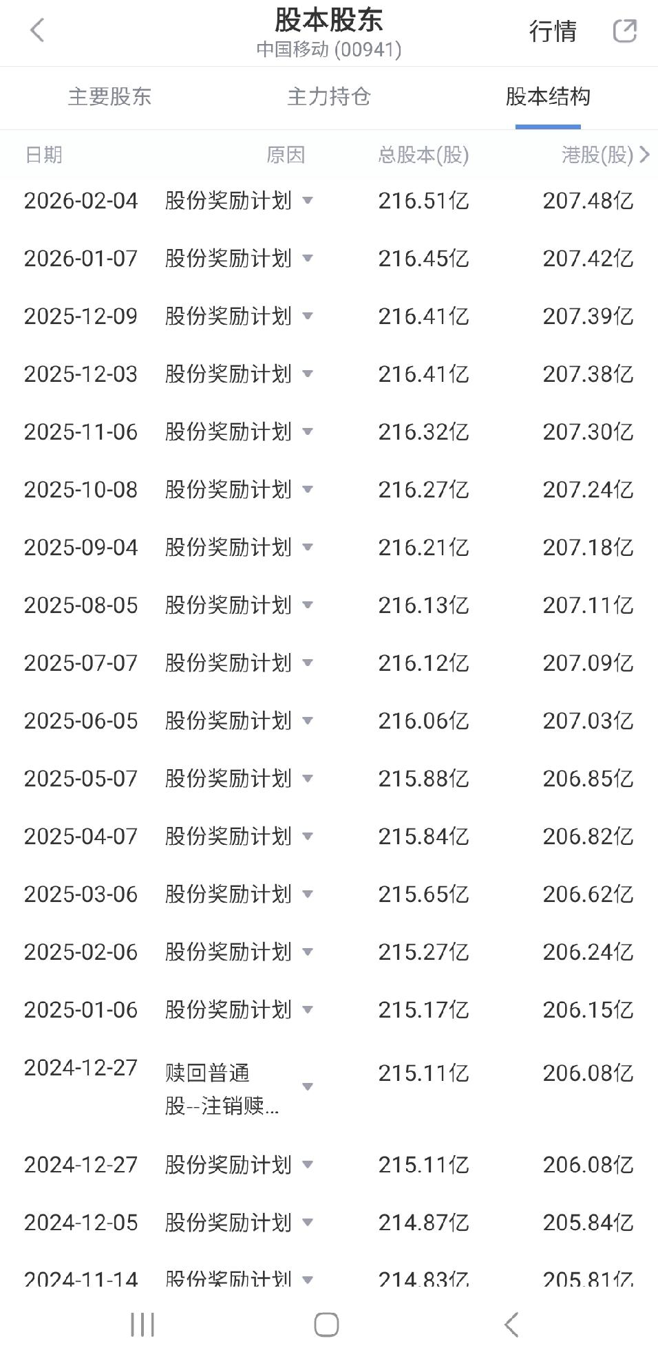 想持有中国移动股票抗通胀?看清楚了,你手中的中国移动股票,正在跟超发的纸币一样,被无休无止地稀释(见图2),所以,就不难理解,为什么中国移动的股价,跌得比美元更快(图1图3)。 如果你认为有一种悲哀,就是持有了贬值的美元,那么在本轮牛市,如果你持有了中国移动的股票,恐怕损失更大。 常说美元超发会稀释你的购买力,但中国移动的“员工奖励股份”,一样在每月稀释你手中的股权(图2)。所以,中国移动的股价,正在以更快的贬值速度,超越被普遍认为已经超发的美元。 中国移动所处的电信行业,已经见到增长的天花板,剩下的问题是,如此月月新增“奖励”股份上市,你所期待的股息,还能稳得住吗? 详细见附文。 呜呜呜呜!