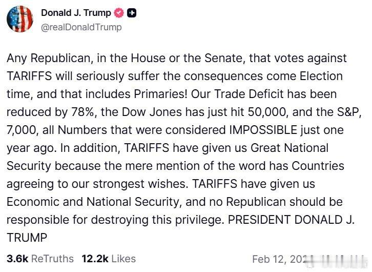 特朗普炫耀政绩 特朗普发文表示:任何在众议院或参议院投票反对关税的共和党人,都将在选举时面临严重后果,这包括初选!我们的贸易逆差已减少 78%,道琼斯指数刚刚突破 50,000点,标普指数达到 7,000点——这些数字在一年前还被认为是不可能实现的。