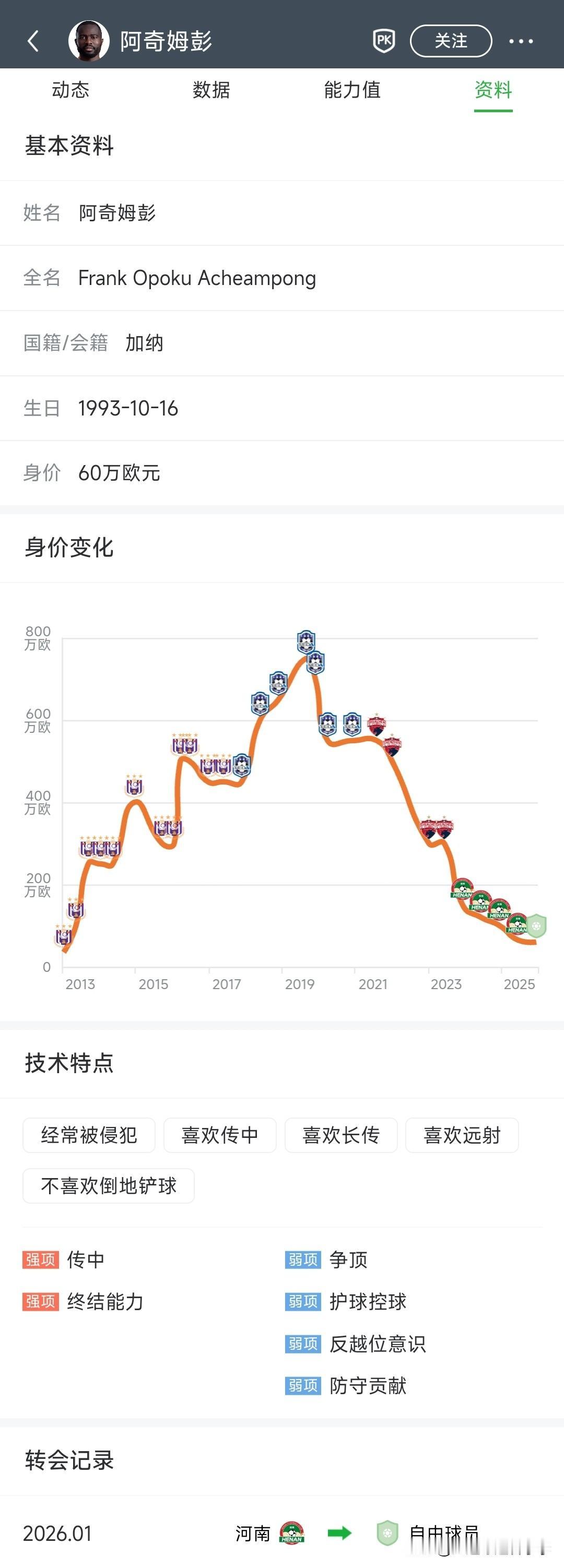 大连英博的第五外援应该是阿奇姆彭了! 阿奇姆彭2017赛季夏窗加盟天津津门虎以来,绝对是中超联赛非常好用的球员,他速度快,盘带能力和射门技术都不错,上赛季代表河南队打了30场联赛进了14球并有3次助攻,这个数据还是相当不错的。 虽然今年阿奇姆彭将33岁,但是以他上赛季的状态来看,如果大连英博能签下他还是够用的,他也是大连英博所需要的类型的球员,在边路有速度能盘带能突破。 如果大连英博的第五外援真的是阿奇姆彭的话,你觉得怎么样?