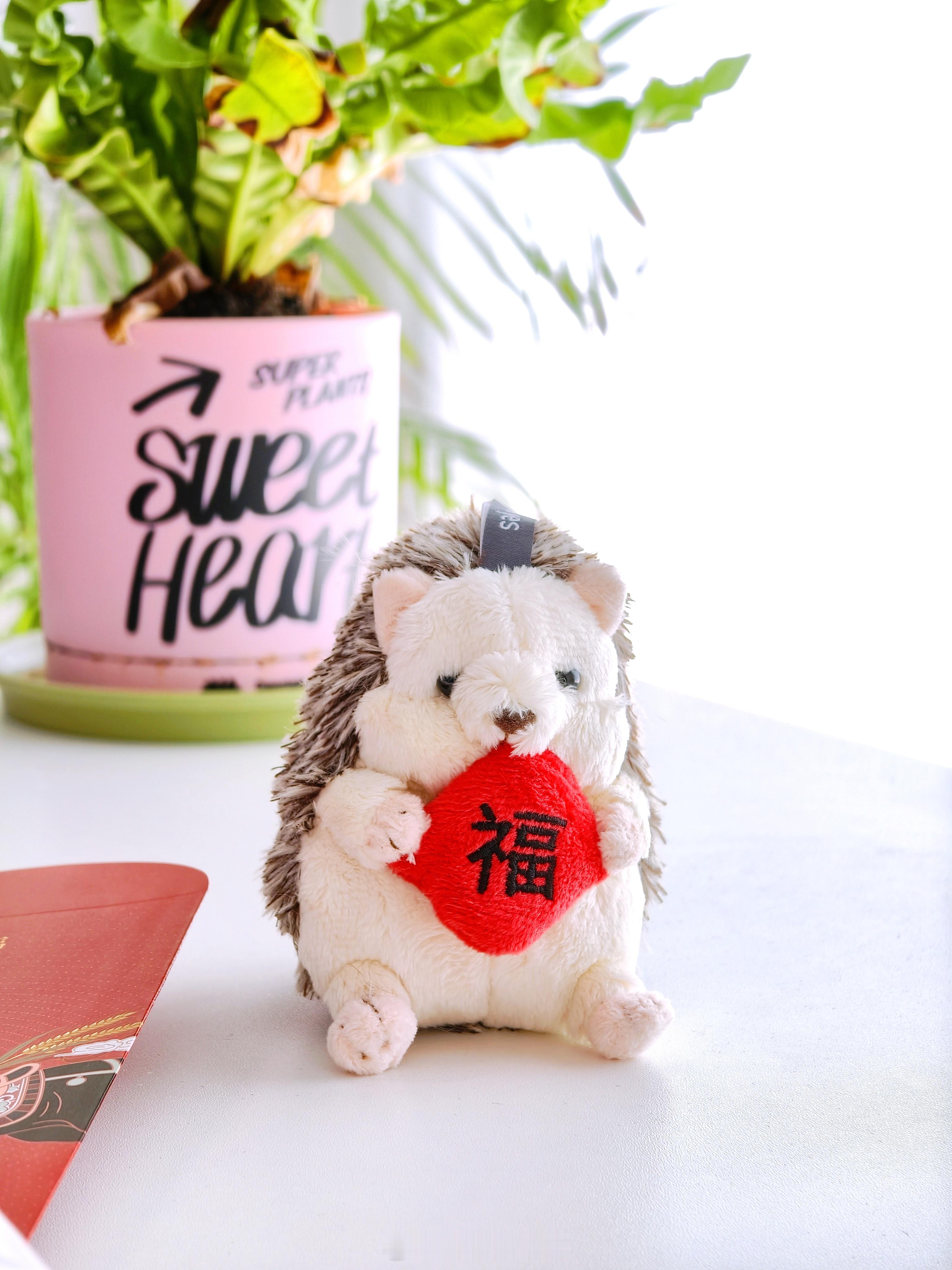 都是一些平时用得上的东西,一个带有日历的日程本、小刺猬玩偶、福字、勋章、化妆包和帆布袋