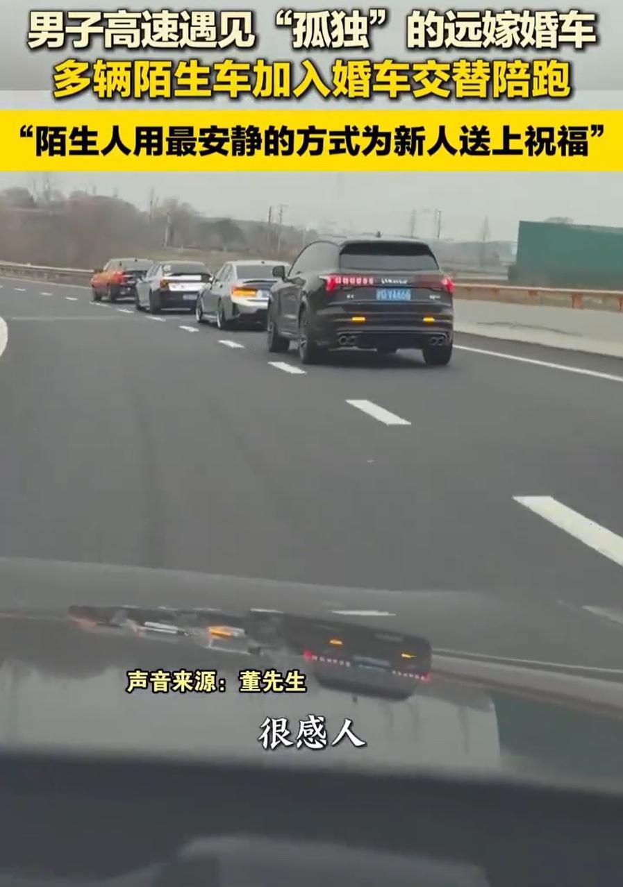 看哭了!上海,一男子开车上高速,突然在路上发现一辆远嫁的“孤独婚车”,没有车队,只有新郎默默开着车拉着新娘,而让人感动的是,高速路上很多陌生车辆看到后都不约而同的加入婚车交替陪跑,让这段路不再变的孤独。 春节返乡高峰期的高速路上,到处都是赶着回家团圆的车流,大家都在朝着家的方向赶路,原本只是再普通不过的春运景象,可这辆婚车却在车流里格外惹眼。 它没有气派的迎亲车队,没有热闹的亲友陪同,就只有新郎一个人开车,载着远嫁的新娘,从上海一路驶向河南,车身只挂着一条简单的红色横幅,写着满心欢喜的告白,简单的文字里,藏着新人的幸福,也透着几分无人陪伴的孤单。 远嫁从来都不是一件容易的事,姑娘离开从小长大的家乡,告别熟悉的亲人朋友,跟着爱人奔赴陌生的远方,本就需要莫大的勇气。 而这场婚礼,褪去了所有盛大的仪式,没有喧嚣的场面,没有簇拥的人群,只有两个人相伴行驶在漫长的高速上,看着这样的场景,难免让人觉得心里发酸。 谁也没想到,高速上这些素不相识的车主,会用最默契的方式,给了这对新人最温暖的惊喜。 最先发现这辆孤独婚车的人,没有选择匆匆驶过,而是用挥手的方式,送上了无声的祝福。 这个简单的举动,像是打开了善意的开关,越来越多的车辆留意到了这辆特殊的婚车,也读懂了这份藏在孤单里的幸福。 没有提前商量,没有统一安排,大家都心照不宣地放慢了车速,自发加入护航的队伍。 有的车打开双闪,默默跟在身后守护;有的车轻按喇叭,当成最朴实的礼炮;就连路过的大货车司机,也探出头竖起大拇指,用司机之间独有的方式,送上最真诚的敬意。 短短十几公里的路程,一群互不相识的人,组成了一支临时却格外暖心的婚车队,没有华丽的排场,却有着最真挚的温柔,把原本冷清的旅途,变成了充满爱意的迎亲路。 就连收费站的工作人员,看到横幅后也忍不住嘴角上扬,特意送上一句不在标准话术里的恭喜,让这份温暖又多了一份细腻。 一直独自开车的新郎,看着身边不断护航的陌生人,瞬间红了眼眶。 他原本做好了独自带着新娘走完这段路的准备,心里藏着对远嫁新娘的愧疚与压力,以为这场婚事会少了很多热闹,却没想到被一群陌生人温柔托举,收获了最意外、最体面的祝福。 春运路上,每个人都有自己的归途,都盼着早点回家吃团圆饭,可大家却愿意为一对陌生新人停下匆匆的脚步,用方向盘和油门,送上最沉默的支持。 这不是刻意营造的浪漫,只是普通人刻在骨子里的善良,是见不得人孤单的温柔。 这些萍水相逢的人,或许在岔路口分开后,此生都不会再相见,可那段并肩同行的温暖,那份不期而遇的善意,早已成为这段婚姻里最珍贵的回忆。 平凡的生活里,正是这些不起眼的小善意,拼凑出了最动人的人间温情。 大家对此怎么看?欢迎评论区留下您的观点!