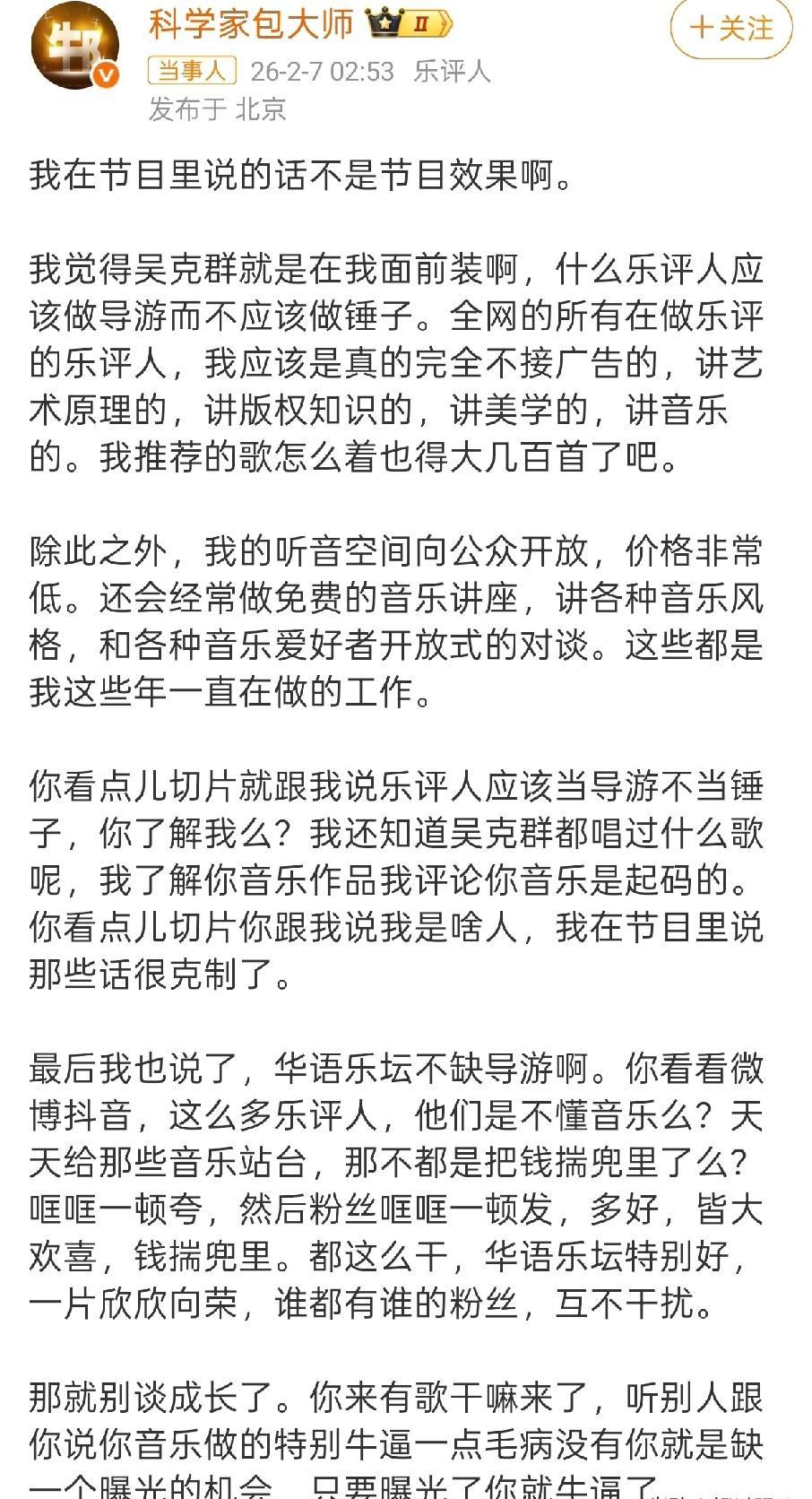 吴克群一年前埋下的“心理陷阱”,乐评人梁源精准地踩了进去,还把自己炸得粉碎。 吴克群根本没跟他谈音乐。 他像个老道的心理医生,直接剖开梁源的外壳,指着里面说:你不是在搞乐评,你是在“迁怒”。 你把被网暴的火,撒到我们身上。 一年后,梁源用一篇万字长文,咆哮着“吴克群的音乐是垃圾”,完美印证了这个诊断。 他以为自己举起了“正义的铁锤”,但在所有人眼里,他只是一个情绪失控的病人,挥舞着自己的病历单。 这世上,最先击垮你的,从来不是别人的批评,而是你失控的情绪。
