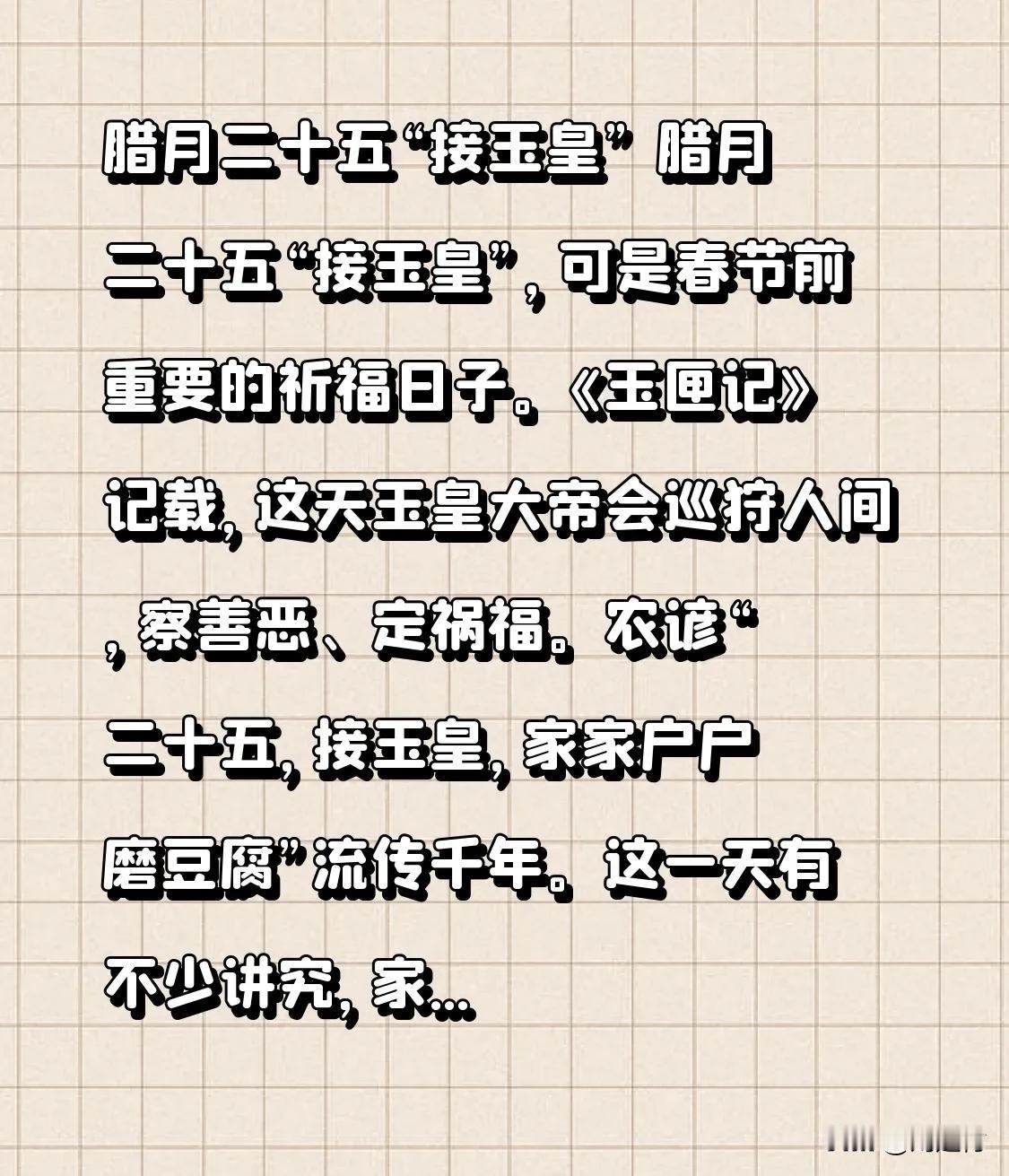 腊月二十五“接玉皇” 腊月二十五“接玉皇”,是春节前重要的祈福日子。据《玉匣记》记载,这天玉皇大帝会巡狩人间,察善恶、定祸福。农谚“二十五,接玉皇,家家户户磨豆腐”流传千年。 这一天讲究颇多,家中绝对不可吵架。传说玉皇大帝会带着灶王爷的奏折下界核查,争吵斗嘴是大忌。如《西游记》里凤仙郡郡侯,在这天祭祀时与妻子争执,触怒玉帝,致使三年滴雨不降。抛开迷信成分,这规矩也蕴含生活智慧,年底事务繁杂,争吵会破坏祥和氛围。“接玉皇”也是在提醒众人向善,促进家庭和谐。这是统治者编造的,劝导民众与人和气和善的小故事。