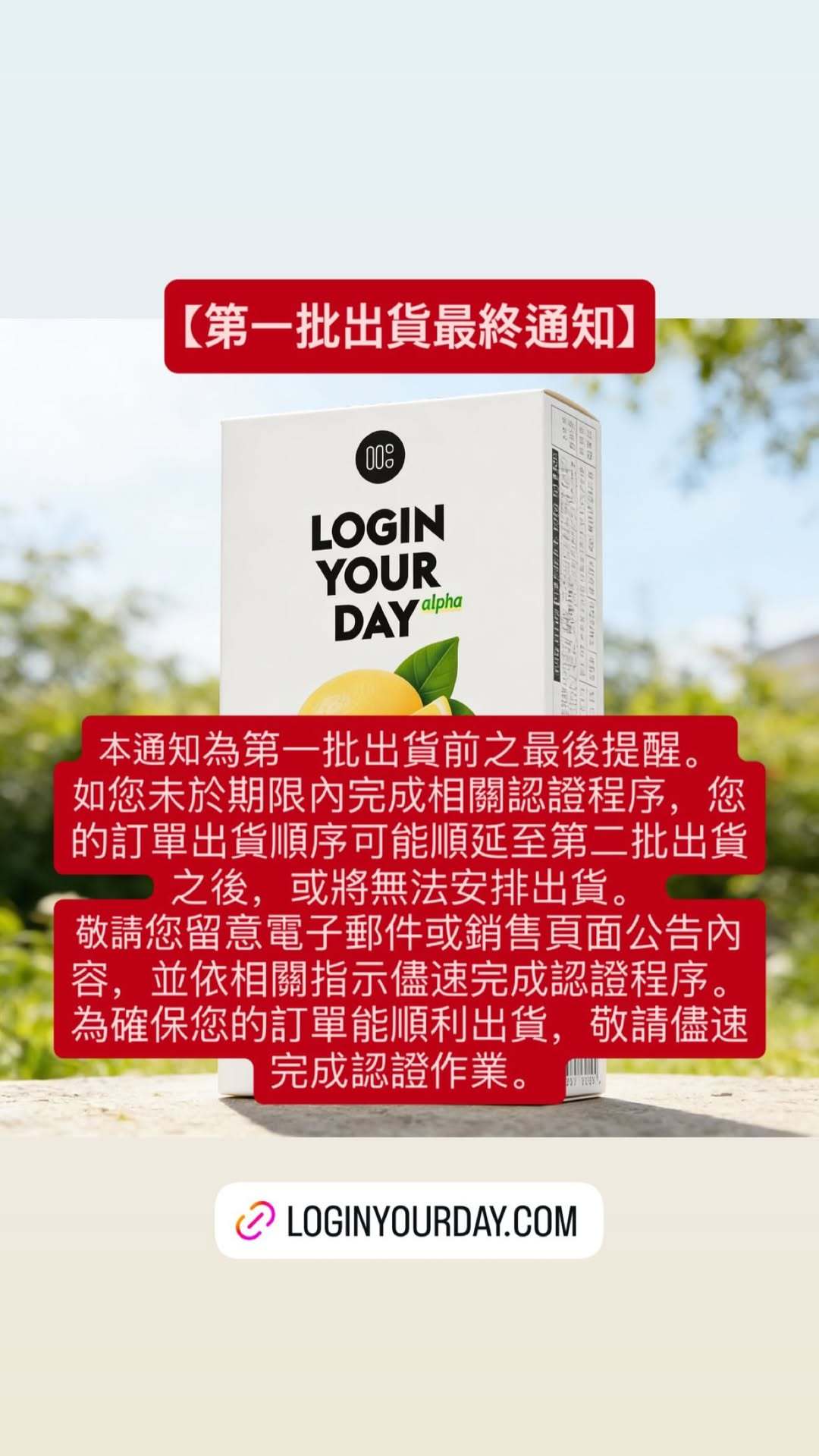 本通知為第一批出貨前之最後提醒。 如您未於期限內完成相關認證程序,您的訂單出貨順序可能順延至第二批出貨之後,或將無法安排出貨。 敬請您留意電子郵件或銷售頁面公告內容,並依相關指示儘速完成認證程序。 為確保您的訂單能順利出貨,敬請儘速完成認證作業。