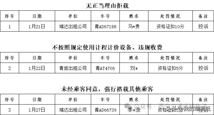 曝光!西宁3名的哥被罚!一颗老鼠屎坏了整锅汤! 2026年1月16日至31日,西宁3起出租车违规被当场查处:拒载、不打表乱收费、强行拼客!司机被扣分、信誉扫地! 个别司机耍横宰客,丢的是全城出租的脸!乘客寒心,行业蒙羞! 看看现状:车龄老、车厢脏、座位破,挣钱难不假,但服务再摆烂,谁还愿坐? 滴滴围城,巡游出租已风雨飘摇。再不把态度端起来,把计价器用起来,把拼客规矩守起来—— 这碗饭,真要被人端走了! 出租车违规运营 西宁出租车