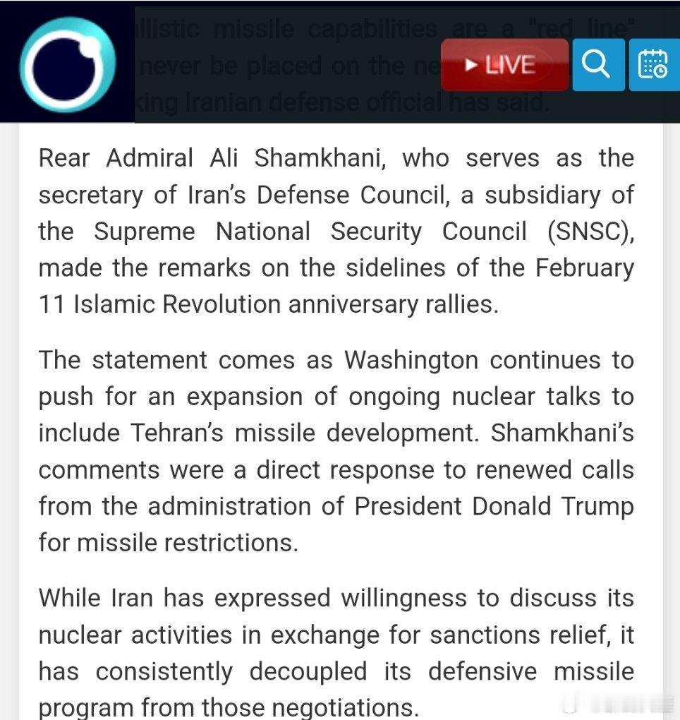 伊朗导弹计划永远不会被摆上谈判桌:沙姆哈尼(伊朗官网)