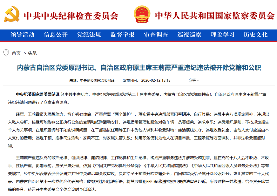 中央纪委国家监委网站2月12日消息,经中共中央批准,中央纪委国家监委对第二十届中央委员,内蒙古自治区党委原副书记、自治区政府原主席王莉霞严重违纪违法问题进行了立案审查调查。