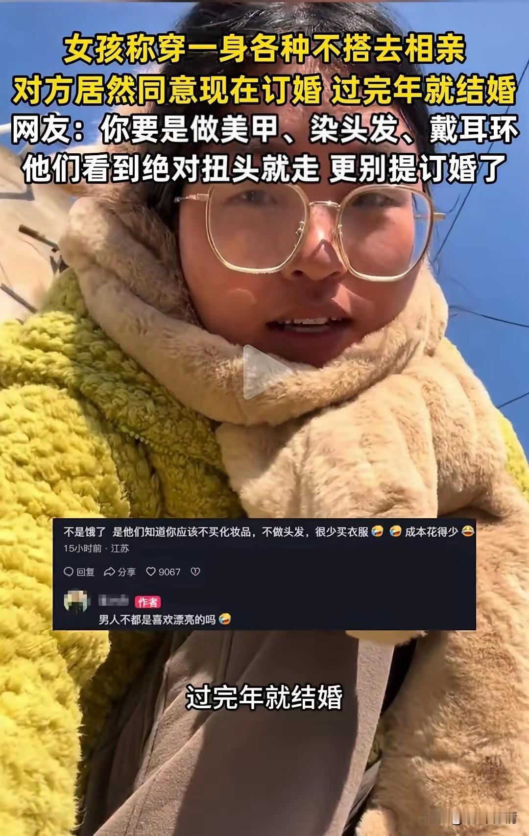 安徽女孩回家后被逼相亲,为了摆烂,她直接穿上了很土的衣服,还故意装丑! 想通过这样的方式让男方知难而退,结果相亲现场让她想不到,男生看到他这样的打扮居然非常满意! 还商量着现在就订婚,然后直接结婚,这直接让她傻眼,她万万想不到,现在的男生都这么饥渴! 这就是典型的女性思维,别人觉得自己丑了就没人娶,可现实根本不是这样的,现实中美女谈恋爱的确实很, 但最后结婚的却很少,因为男人是非常理性的,该和什么人恋爱?和什么人结婚心里门清! 相亲市场也是如此,漂亮的女人无人问津,反而那些没有打扮,长相普通的很受欢迎! 大家觉得安徽女子扮丑居然被看上这事怎么看? 女生相亲条件 女生相亲心理 大龄姑娘相亲 大龄女子相亲