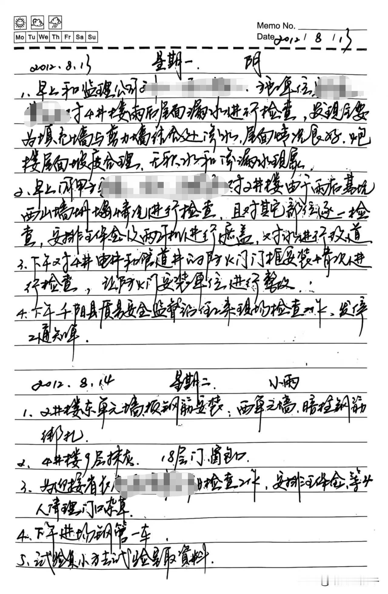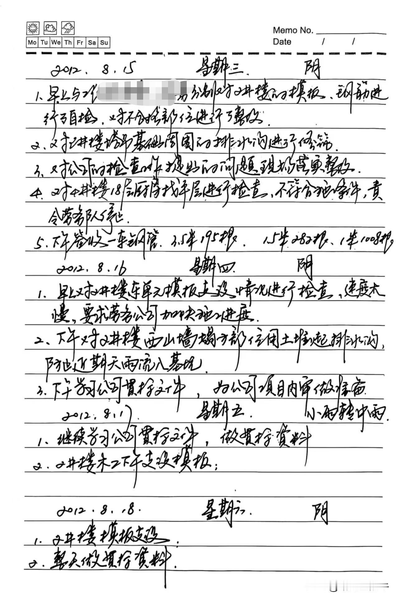土木人最珍贵的老物件了[流泪] 一年一度的大扫除, 无意间翻到了14年前的施工日志, 一笔一划记载着当年的烈日、寒风、熬夜、验收、浇筑混凝土… 别人看是纸, 土木人看,是整个沸腾和热血的青春。 从刚入行的青涩,到慢慢扛事、懂技术、管现场…… 现在翻起来,是不是每一页都能想起那天的天气、那道工序、那群一起熬夜的人和朋友?