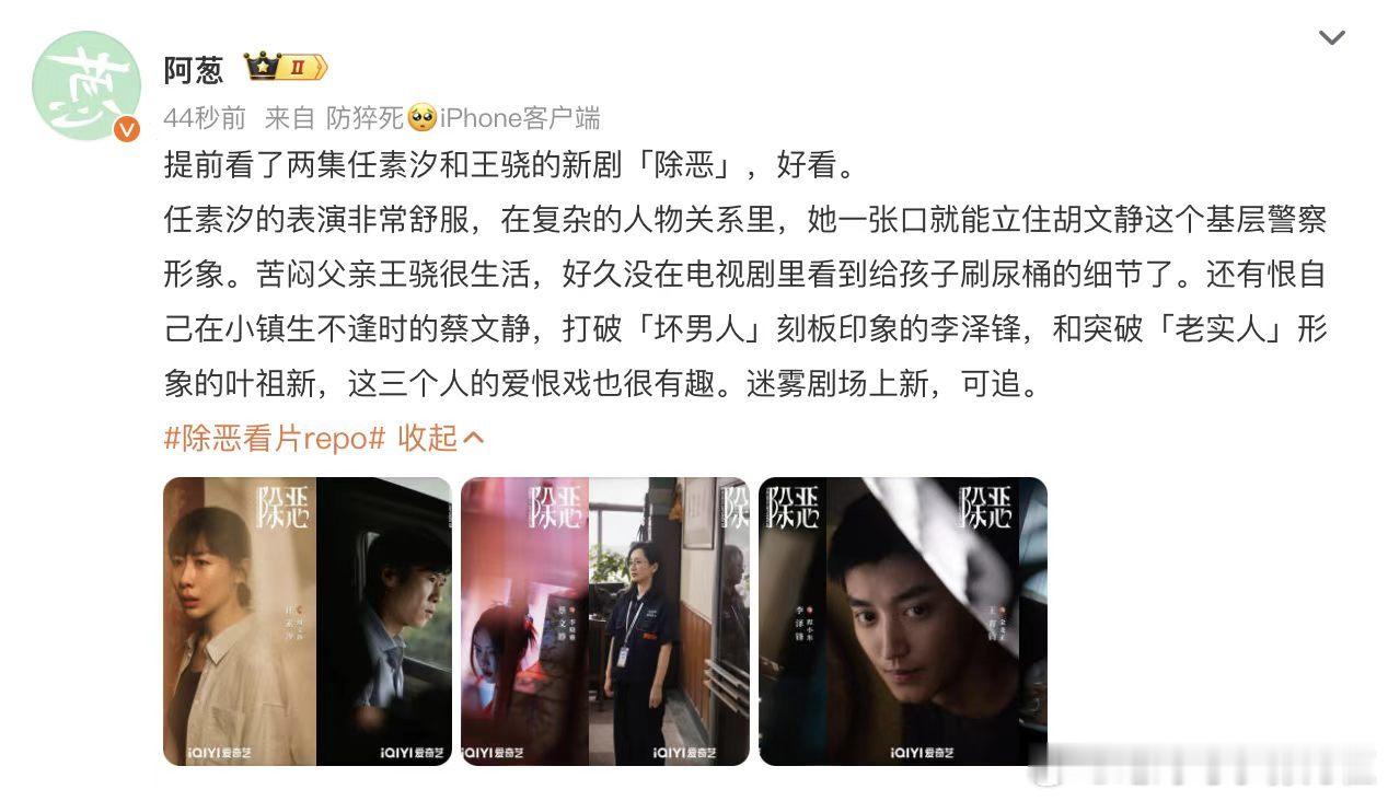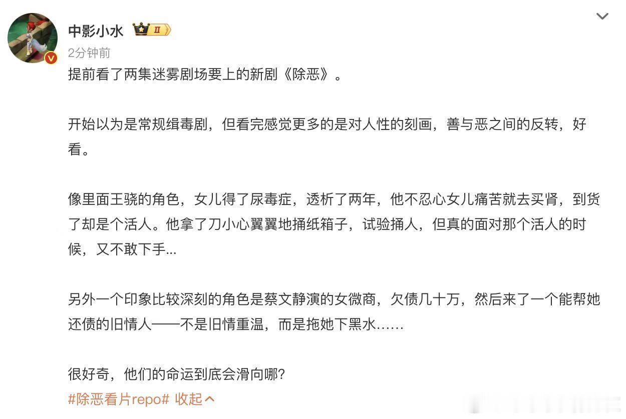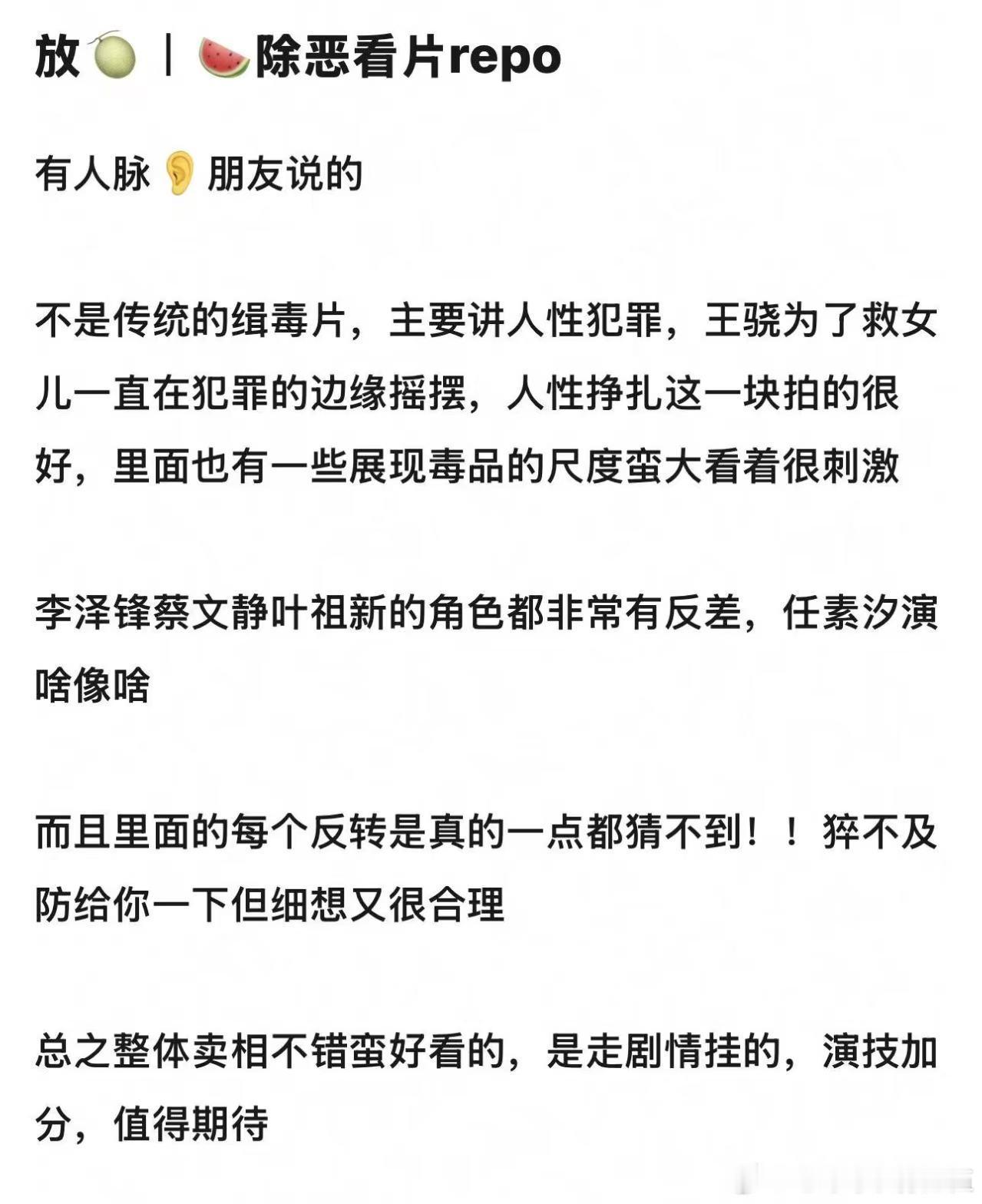 看完除恶看片repo直接被勾住!质感在线、人物立体,不到最后猜不透结局,人性犯罪题材太戳我,坐等 定档!