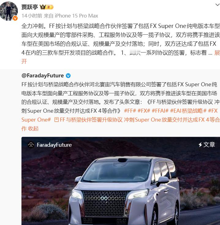 此前贾跃亭在美国发布新车,网友一直好奇车是怎么造出来的,预估肯定是有国内这边车企帮忙了,但是又一直没有官方的消息。贾跃亭 不过现在,贾跃亭及Faraday Future(FF)宣布,与河北寰宙汽车销售有限公司签署一揽子协议。