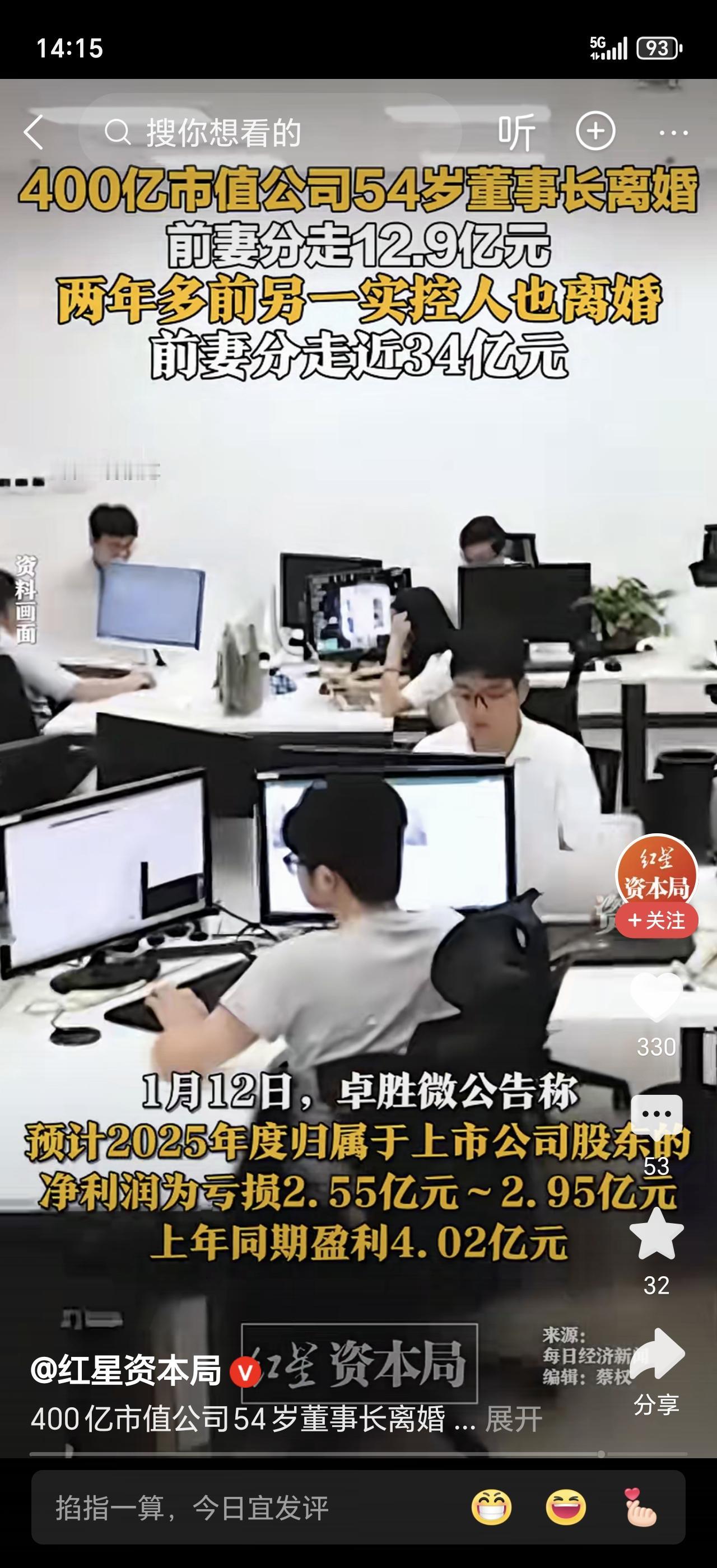 最新消息!A股又双叒出天价离婚案,这回主角是国产芯片巨头董事长。一纸公告,前妻直接划走近13亿股票!网友炸锅:这分手费也太离谱了! 2月11日深夜,射频龙头卓胜微突然丢出重磅炸弹。公司实控人、52岁的董事长许志翰,与妻子张昱正式官宣离婚。财产分割方案随之曝光——许志翰将名下1715万股直接划到前妻名下,按当天收盘价75.16元算,整整12.89亿元! 这不是小数目。卓胜微上市六年,许志翰年薪312万,挣一辈子也攒不出这笔钱。但股权一分割,前妻一夜之间就成了持股3.21%的重要股东。 更耐人寻味的是,公告写得极为周全。张昱虽然拿走近13亿股票,但全部表决权依旧委托给许志翰行使。公司连夜发承诺函:实控人团队6个月内不减持。翻译一下:控制权没丢,股价别慌。 但眼尖的股民立刻翻出旧账——这可不是卓胜微第一次上演“天价分手”。2023年,另一实控人唐壮离婚,前妻易戈兵分走34亿。同一家公司,两年两起,加起来近50亿。有人调侃:这是芯片界的离婚专业户吗? 许志翰履历光鲜,清华本硕、留美海归,2025年仍以80亿财富登上胡润富豪榜。但光环背后,公司正经历至暗时刻。就在一个月前,卓胜微预告2025年巨亏2.55亿至2.95亿,上市以来首度亏损。一边亏钱,一边分钱,时间点微妙得让人浮想联翩。 监管层近年对“离婚式减持”盯得很紧。2025年就有规定:离婚分割股权,必须完整披露锁定期、减持计划,严防借分手绕道套现。卓胜微这次把承诺锁仓、表决委托、减持限制全摆上台面,算是一次合规的“标准答案”。 但股民心里的问号没消停:真是感情破裂,还是财务安排?是正常分割,还是技术性离婚?这13亿,是给前妻的体面,还是给市场的表演? 你觉得,这种动辄十几亿的A股天价离婚,是富豪的正常财产分割,还是另有算盘?评论区聊聊你的看法。
