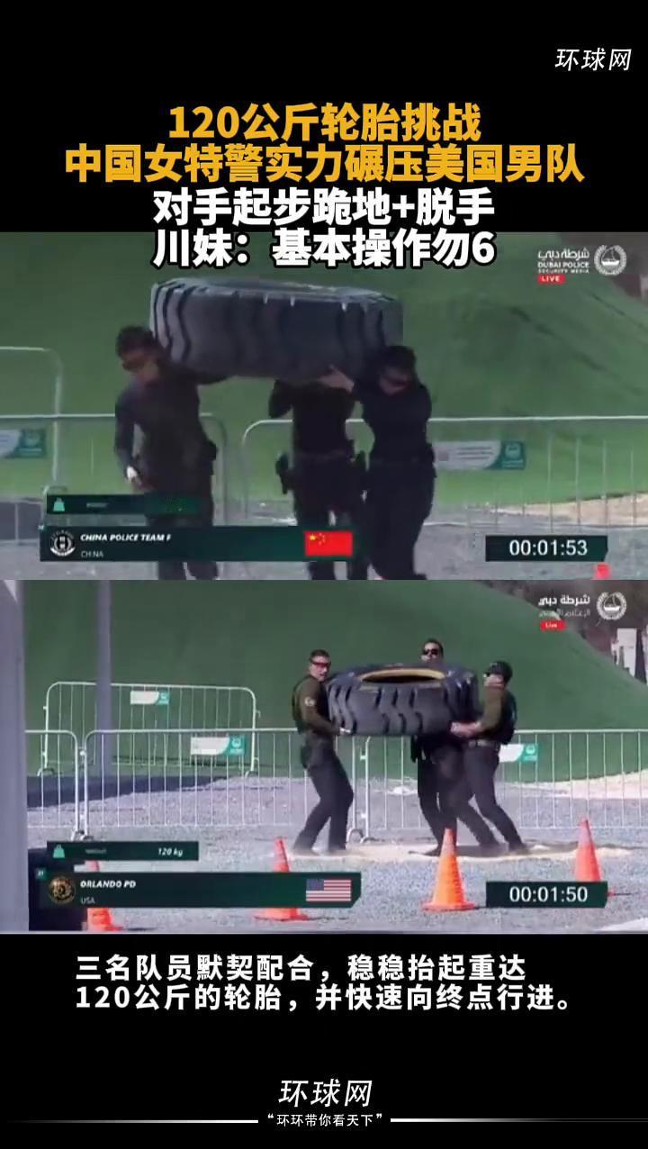 120公斤轮胎挑战,中国女特警实力碾压美国男队,对手起步跪地+脱手。 环球网。 2月9日,第七届阿联酋特警挑战赛进入第三个比赛日。在抬轮胎项目中,中国四川女子特警队表现亮眼,三名队员默契配合,稳稳抬起重达120公斤的轮胎,并快速向终点行进。相比较之下,美国奥兰多特警男队则出现多次失误:三名队员在起步阶段就险些未能抬起轮胎,一名队员甚至因发力不稳而跪倒在地,最终轮胎在起点附近脱手。