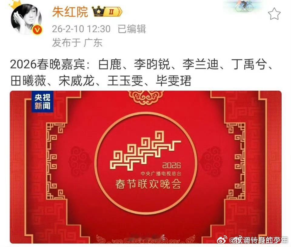 2026春晚:李昀锐、白鹿、宋威龙、王玉雯、毕雯珺李兰迪、丁禹兮、田曦薇