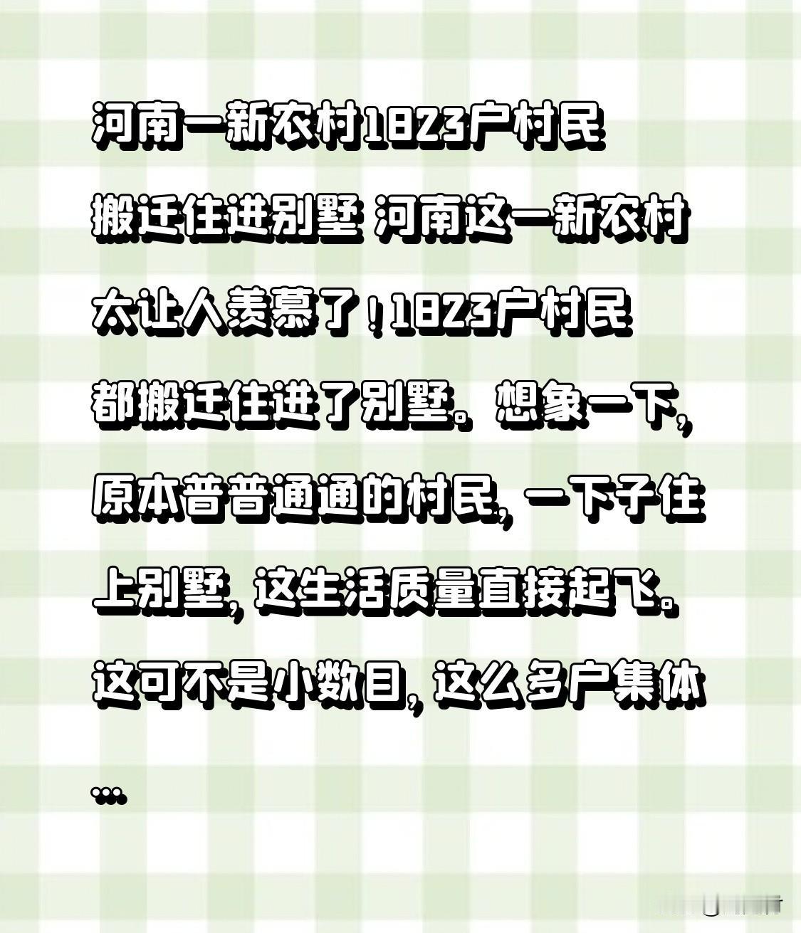河南一新农村1823户村民搬迁住进别墅 河南一新农村1823户村民搬迁入住别墅,着实令人羡慕!1823户村民集体搬进别墅,原本平凡的村民生活质量瞬间提升。如此大规模改善居住条件,背后离不开当地政策支持与努力。 住别墅与普通住房体验迥异,宽敞空间、舒适环境,让生活档次大幅提升。这不仅是居住环境的改善,更彰显了农村发展的巨大进步。 期望这样的新农村越来越多,让更多村民过上好日子。