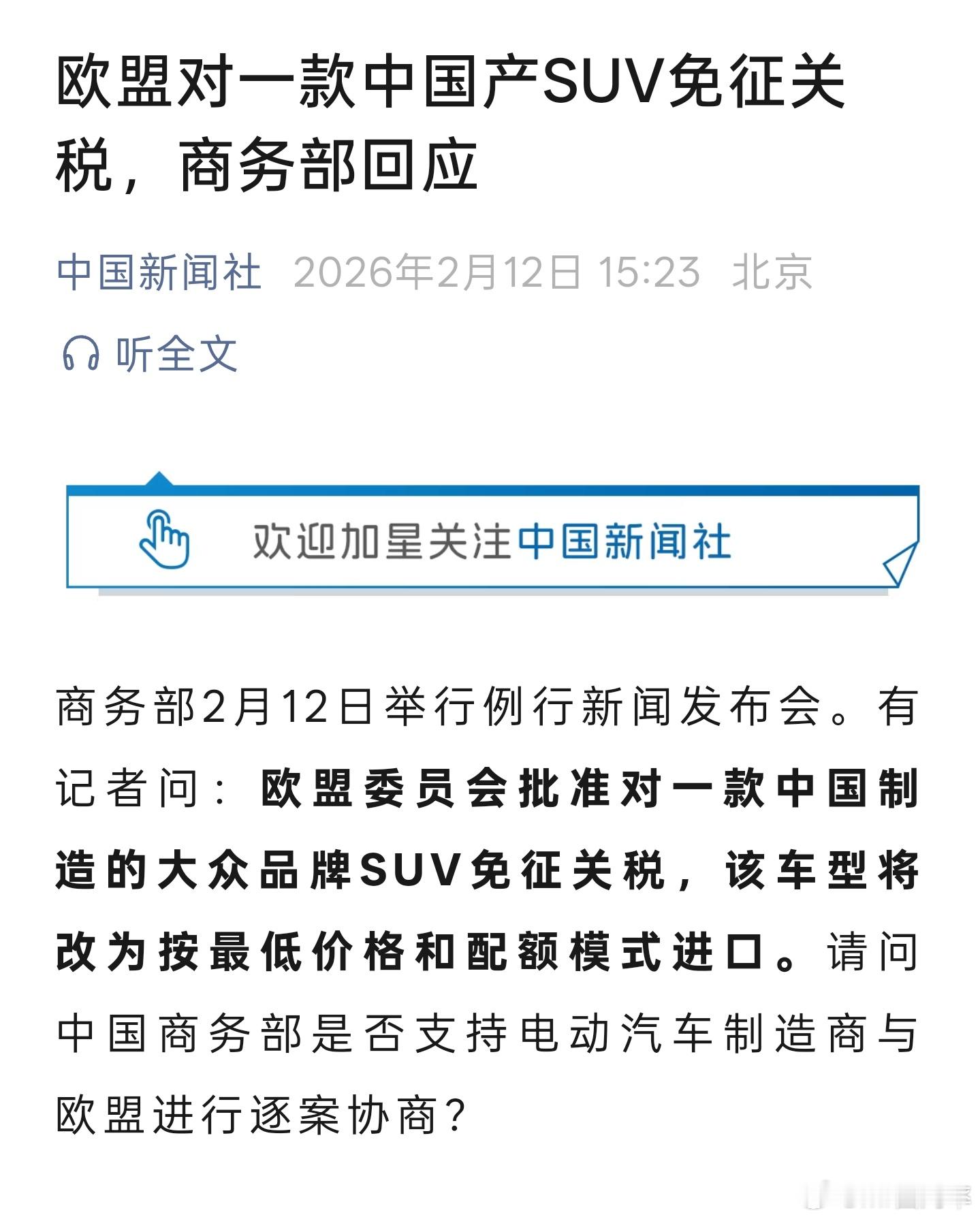 好消息,虽然是大众,但是也是中国产的车出口欧洲免关税的破冰