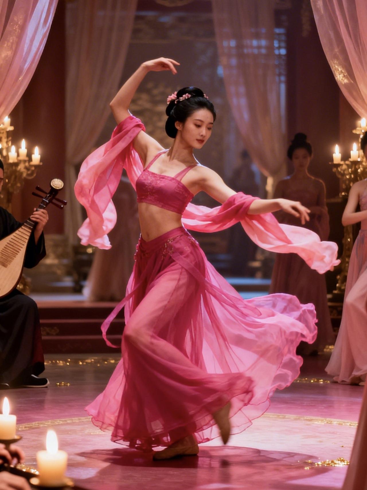 《红绡舞》 烛火鎏金,漫过朱红的殿宇 她的裙裾,是揉碎的烟霞 从盛唐的画轴里,漫卷而出 琵琶弦上,落满了长安的月色 她抬臂,水袖便挽住了半阙春风 指尖轻扬,抖落的是 千年未散的,盛世余温 粉纱如雾,裹着流动的骨相 每一次旋身,都让时光慢了半拍 腰肢是江南的柳,眼波是塞北的月 在这方寸之地,舞出了万里山河 烛影摇红,映着她鬓边的花钿 每一步踏碎的,都是人间的喧嚣 衣袂翻飞处,有盛唐的风 从她的裙摆间,轻轻穿过 这不是舞,是一场盛大的奔赴 赴一场与千年风雅的约定 在琵琶声里,在烛火摇曳中 她把自己,活成了一幅流动的盛唐画卷 沉舟锁红绡 红绸梦幻照 红绡美人 红绡 宫红绡 红裳舞韵集 红舞颂 青绡舞