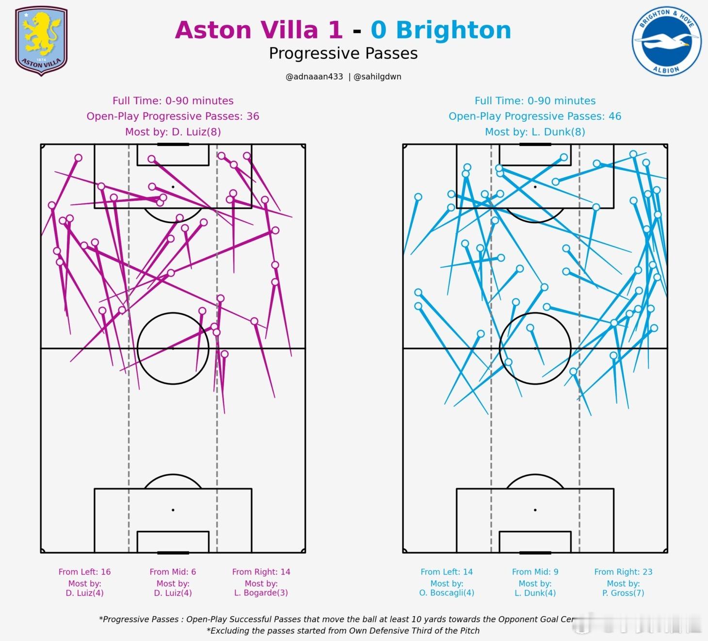 维拉及布莱顿渐进传球(图1)和持球推进(图2)渐进传球(图1)维拉36次,左路16次,中路6次,右路14次布莱顿46次,左14,中9,右23