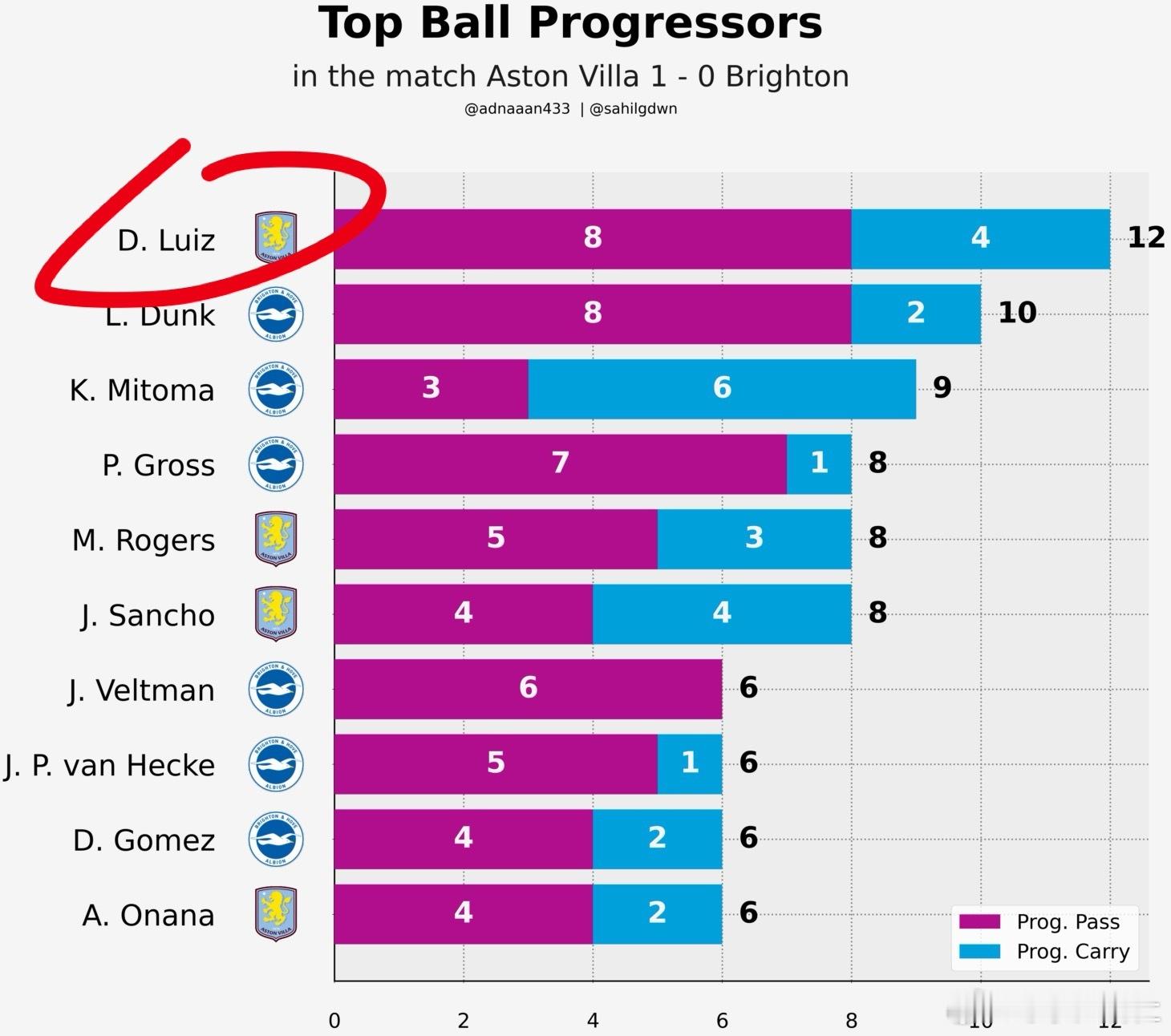 D路易斯是两队渐进传球(8)和持球推进(4)次数最多的球员,共计12次(图3)。布莱顿的邓克以10次仅次于他。