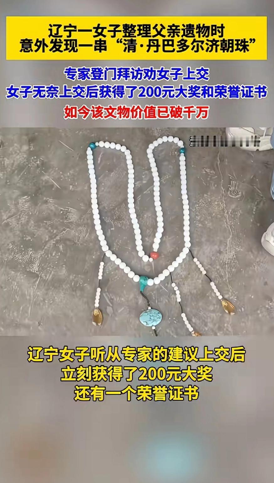 辽宁一女子整理父亲遗物时,意外发现一串 “清 丹巴多尔济朝珠” 专家登门拜访劝女子上交,女子无奈上交后获200元大奖和荣誉证书。如今该文物价值已破千万。 1988年,辽宁女子刘春花整理父亲遗物,在旧木盒里发现串“项链”。原来,十年前父亲老刘在洪水泥汤里捡到这串花花绿绿的石头子,串起来给闺女当玩意儿。 刘春花找专家鉴定,专家一看惊呆了,这竟是清代高等级官员的朝珠,推测来自1967年被破坏的丹巴多尔济合葬墓。 专家登门劝她上交。刘春花没犹豫,主动交了出去,获200元奖励和荣誉证书。 如今这朝珠在辽宁省博物馆成了“网红”。她的做法保全了珍贵文物,诠释了正确的价值观,值得点赞。