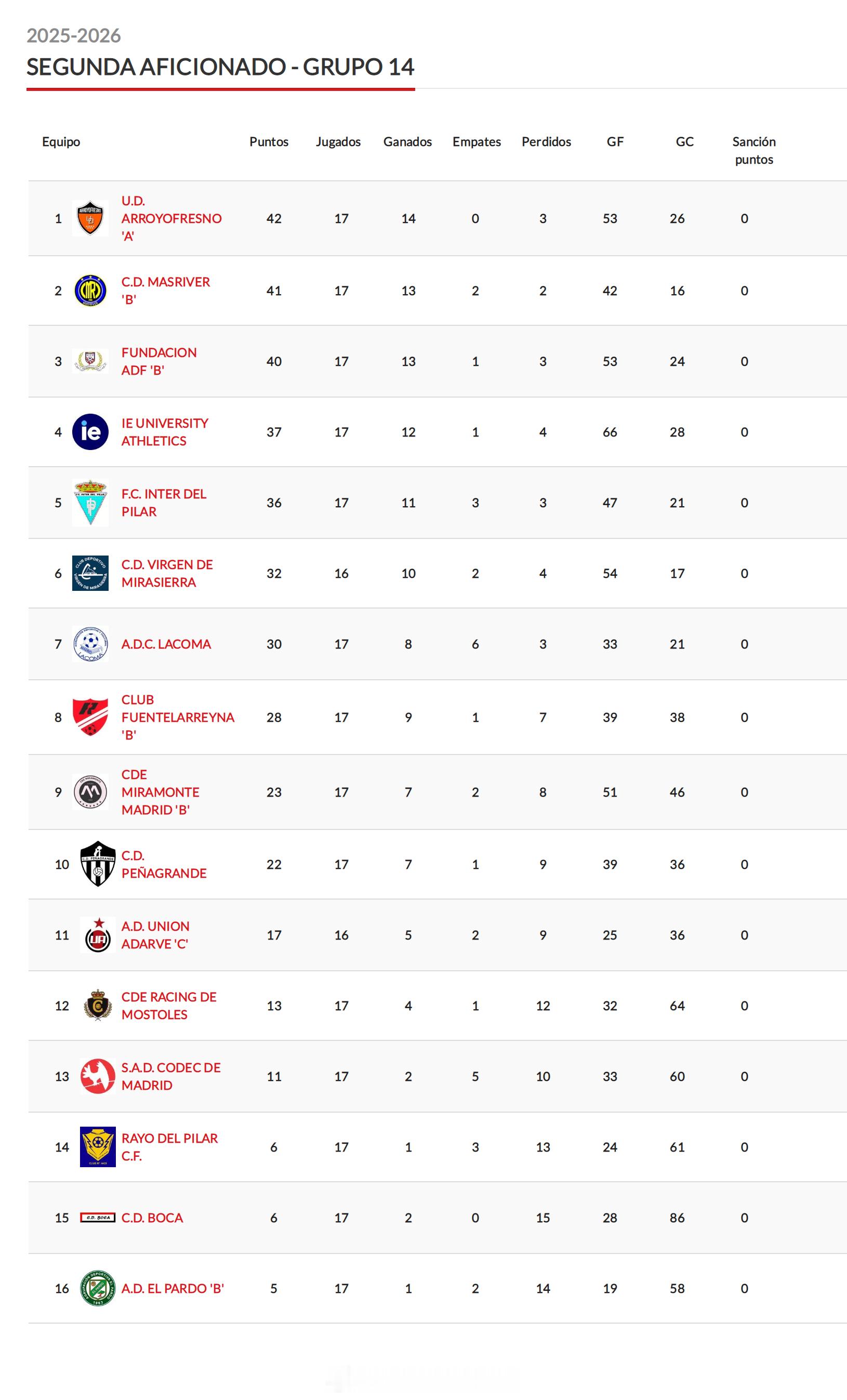 留洋-积分榜 马德里自治区乙级联赛(9)第14组
