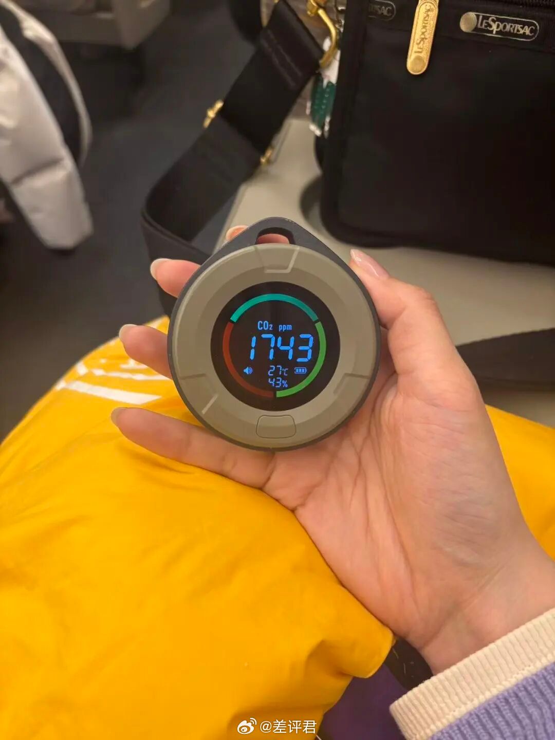 直到终点站我们快下车了,我推测可能是快到站了,高铁上关掉了新风系统,再加上大家起身拿行李、纷纷挤在车厢两头,局部二氧化碳浓度会瞬间爆表,短暂达到了1700+ppm。