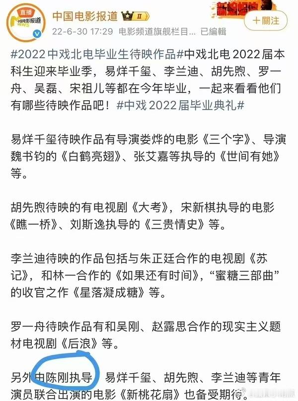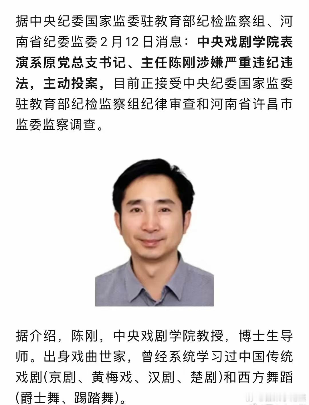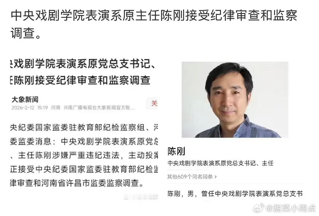中戏表演系原主任陈刚主动投案自首 ,曾执导由易烊千玺、刘昊然、李兰迪等主演的《新桃花扇》,也是张雪迎的老师 这是发生什么事了?这不得好好查查相关的人?