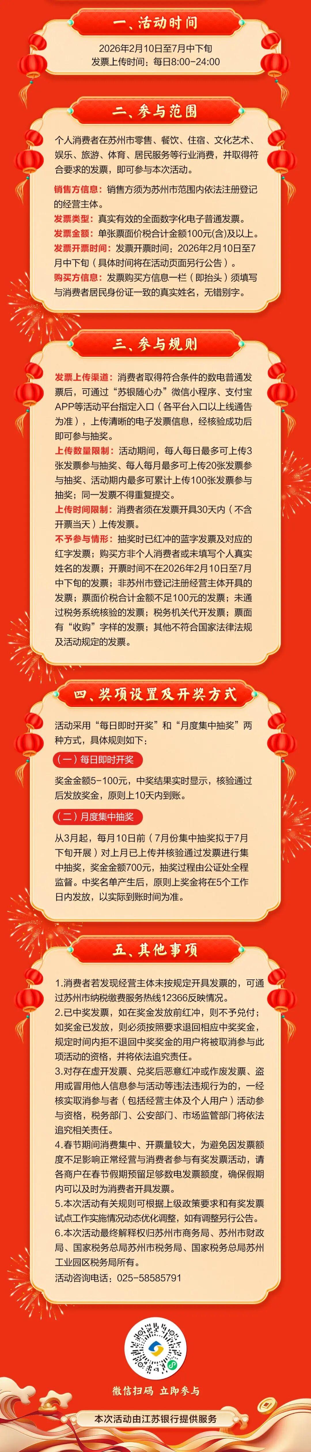苏州的朋友们注意啦!2.6亿有奖发票真的开抢了,已经有人领到100元红包,我都替大家开心! 从2月10号开始一直到7月中下旬,整整半年时间,新春期间就砸1.3亿,力度真的超大。每天都能上传3张发票参与抽奖,平时吃饭、购物、住酒店,只要开了正规发票,随手传上去就有机会中奖。 身边已经有朋友晒中奖截图了,没抽到的也别着急,活动时间长、机会多,天天都能参与。我觉得这波福利特别实在,既是鼓励大家养成索票护税的习惯,又能给日常消费添点小惊喜。 提醒大家:消费完一定记得要发票,别浪费这免费的中奖机会!说不定下一个领红包的就是你!