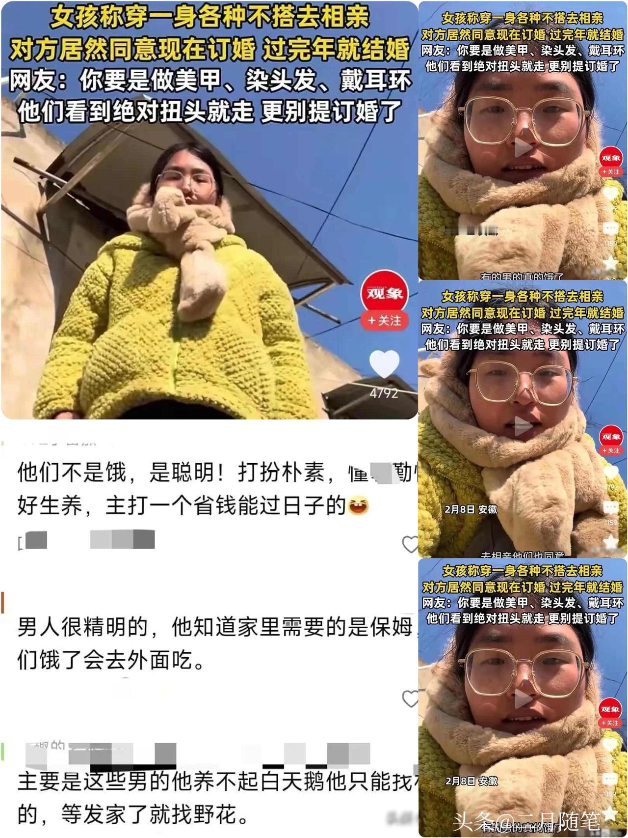 女孩故意穿丑去相亲, 本想劝退, 竟被当场相中,网友:男子太精明了! 姑娘被家里催婚催得紧,干脆穿着厚棉裤, 素颜朝天去相亲, 想着这样总能把人吓跑。 谁知对面的男生一见她就笑开了花, 饭局还没结束就急着问能不能定下来, 说就喜欢她这份不做作的劲儿。 姑娘一脸懵圈: "现在男生都这么不讲究了吗?" 原来这位男生已经相了七次亲, 每次遇到的都是妆容精致、 说话像背台词一样的女生, 让他感觉像是在选美。 他想要的不过是个能一起过日子的实在人, 会修马桶、 会带娃、 能踏实存钱的那种。 在他眼里, 真实比漂亮要重要一百倍。 这事在网上传开后, 有人说男生眼光毒辣。 其实他只是厌倦了那些过度包装的恋爱。 现在太多人把生活过成了表演, 连打个嗝都要练习姿势。 反倒是姑娘这身随性打扮, 让他觉得特别安心。 说来讽刺, 在这个美颜滤镜满天飞的时代, 真实反倒成了稀缺品。 最后两人互加了微信, 男生的头像是在菜市场拎着大白菜开怀大笑的照片, 没加任何的修饰。 姑娘看着照片里那口大白牙, 突然觉得: 或许这次, 真的遇见了对的人了。 缘分这事, 有时候越随意, 越容易撞上真心! 素颜遇真爱相亲那些事真实最难得不做作才动人过日子看真心女生相亲条件 女生相亲新要求 相亲女
