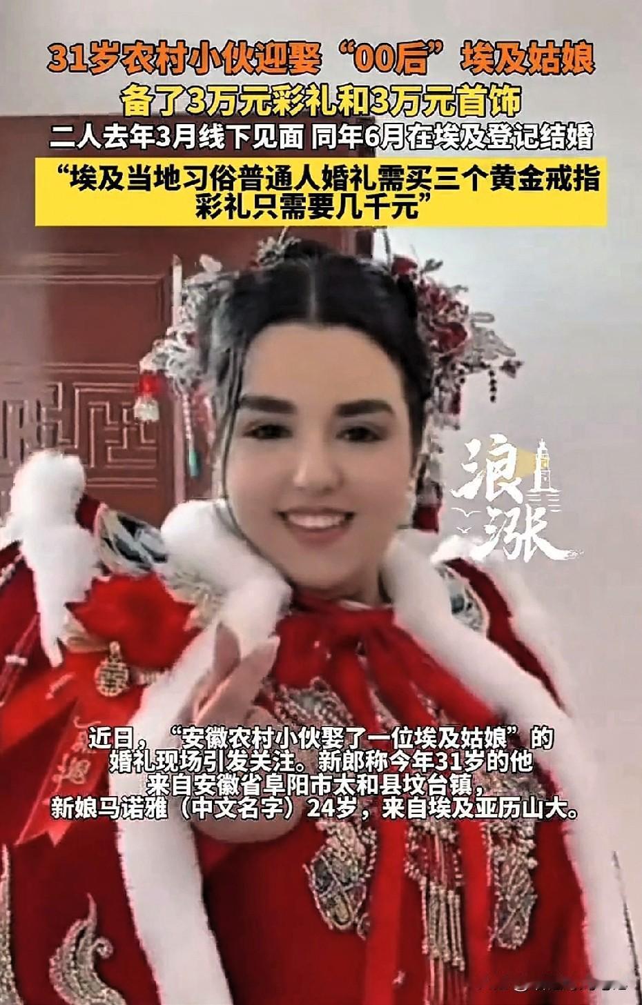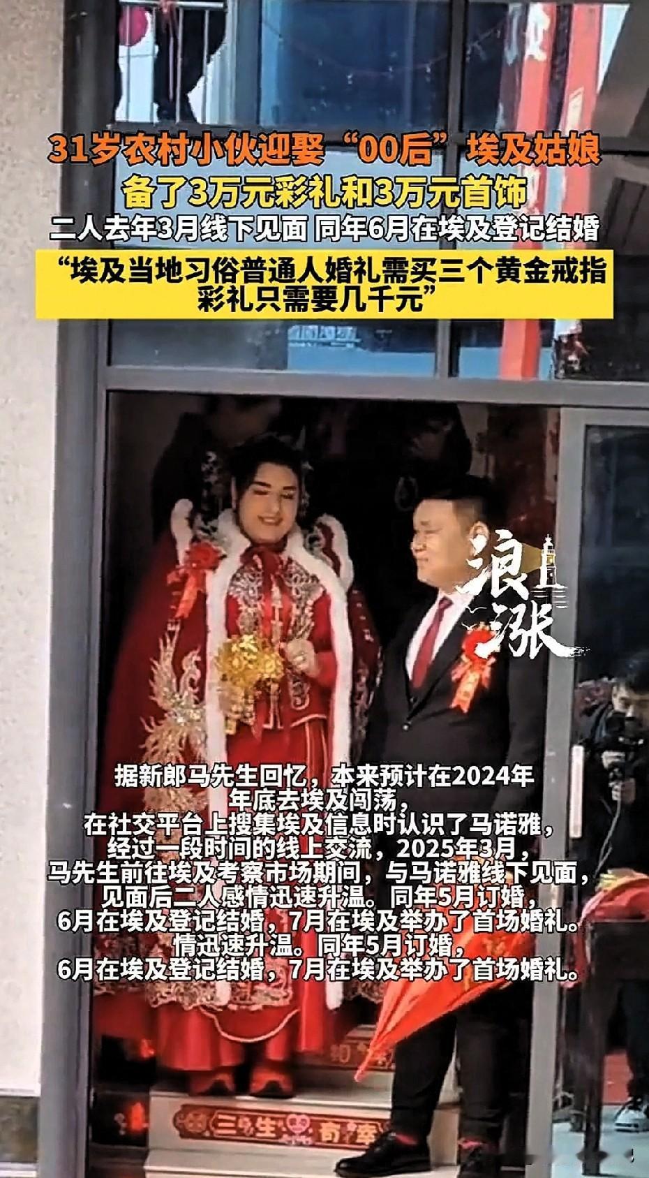 其实这两年,中国男生娶外国媳妇的新闻越来越多。从东南亚到东欧,再到现在的中东,中国男性的国际形象在提升。 以前总觉得"嫁老外"是单向的,现在越来越多的外国女性愿意选择中国家庭,说明咱们的经济实力、社会稳定度得到了认可。 马先生和马诺雅是网恋+跨国+姐弟恋(虽然只差7岁),放在十年前可能会被村里人指指点点,现在却能收获祝福。这种包容度的提升,本身就是社会进步。 马先生原本就是想去埃及做生意,这种"边闯边爱"的模式,比守着一亩三分地等缘分,显然要主动得多。 当然,跨国婚姻也有现实挑战:文化差异、语言障碍、签证问题、未来在哪里定居……马先生夫妇计划4月回埃及做旅游餐饮生意,同时拍短视频记录生活。这条路能不能走好,还得看两人的经营。 但至少,他们的故事告诉我们:爱情这东西,真的不分国界,也不看你有没有房、是不是体制内、彩礼给没给够。两个人看对眼了,愿意一起往前走,祝福他们。 (图源:浪涨新闻)