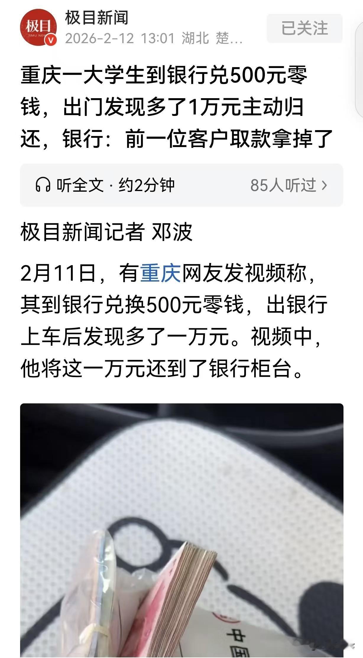 “唾沫星子淹死人!”重庆,一小伙去银行兑500元零钱,柜员把500张崭新的1元面额的纸币,装进袋子里,卷成一块给了他,男子没清点,回到车上才发现多出10000元,是一沓百元大钞。男子觉得应该是上一个顾客落在窗口的,怕是人家的救命钱,就还给了银行,万万没想到,他却被骂惨了。网友:这是拿走想昧下了,又发现银行全方位覆盖摄影头,才不得不还。 2月11日,重庆工程学院大四学生宋健,还没毕业就开始了有条不紊的创业,他来到某银行,打算兑换500元零钱。 他满心想着赶紧办完事儿,回去接着忙手头的事,压根没料到接下来会发生一场让他又气又无奈的事儿。 柜员把装着500张崭新1元纸币的大袋子,卷成一块放进柜台槽子里。 宋健也没多想,更没时间清点,在他看来,就区区500换零,人家柜员很专业,出错的概率不大,他没必要点钱。 他直接一把抓起来钱袋子就往外走,回到车上,他低头一看,把他吓了一跳,袋子外面居然还放着一沓百元大钞,整整10000元! 宋健的心瞬间“砰砰砰”地跳个不停,大脑飞速运转。他第一反应就是,这钱肯定不是自己的,自己就兑了500元零钱,哪来这一万元啊。 再一琢磨,很可能是前面那位客户取钱时没拿完,落这儿了。他脑海里立刻浮现出各种可能,万一这是哪个家庭的救命钱,丢了的人得多着急啊,说不定这会儿正像热锅上的蚂蚁,四处找呢。 想到这儿,宋健没有丝毫犹豫,决定马上把钱还回银行。 毕竟,不是自己的钱,拿在手里也不踏实,都说不义之财分文不取,他虽然没多高尚,但一定是正直之人。他可不想因为这10000元,让自己一辈子良心不安。 而且,他第一次遇到这种事,心里肯定是慌乱的,如果录个视频,就能留下证据,万一节外生枝,出现啥纠纷,他也能自证清白。 同时,他也希望失主看到视频后,能尽快去银行把钱取回去。起码证明自己没把钱据为己有,已经交到银行了。 宋健拿着钱回到银行,把情况跟工作人员一说,工作人员经过核实,很快就联系上了失主。 原来,果不其然,失主就是宋健前面的那位取款人,取钱时马大哈了,没把钱拿完就匆忙离开,一万块没拿走都不知道。 当天下午,失主就把钱领走了。本以为这事儿就这么圆满结束了,可宋健万万没想到,网上却炸开了锅。 一些网友不明真相,开始恶意揣测,说他肯定是想昧下这笔钱,后来发现银行到处都是摄像头,没办法才还回去的。 有人说本来拾金不昧真是值得大家学习,但就是没搞懂银行工作人员既然给你500元,难道那10000元在袋子外一起给你,工作人员都不知道吗? 500元和一万块钱的体积概念,是个人都会感觉到!这样的事有可能吗?其实是想坑人家的,没坑到。 绝对不是出于本心,而是他知道这钱他是拿不走的,没有什么可表扬的,1万块钱,够判刑的了,好险! 看到这些评论,宋健气得浑身发抖。他怎么也没想到,自己一片好心,做了件该被表扬的事儿,却被这么多人冤枉。 他心里又委屈又气愤,自己明明是君子爱财取之有道,坚守正直,怎么就成了别人眼中的“贪心鬼”呢? 但他也明白,清者自清,自己问心无愧就好。他相信,时间会证明一切,那些真正了解他的人,一定会知道他是个什么样的人。 宋健的遭遇,实在让人感慨“好人难做”。他本是一片善心,怕失主着急,毫不犹豫归还多出的一万元,还录视频自证清白,结果却被一些网友恶意揣测。 这反映出当下社 会部分人缺乏信任,总以最坏的恶意去揣度他人善举。 以小人之心,度君子之腹。,这不仅伤害了做好事的人,也会让越来越多的人在面对善举时有所顾虑,不敢轻易伸出援手。 我们应该多一些理解和信任,在未了解事情全貌前,不要急于下结论、发表恶意评论。 每个人都希望生活在一个充满善意和信任的环境中,那就从自己做起,用信任和鼓励去对待他人的善举,让好人不再“难做”,让生活充满正能量。 《刑法》第270条规定,将代为保管的他人财物非法占为己有,数额较大,拒不退还的,处二年以下有期徒刑、拘役或者罚金。 在此案例中,如果宋健将多出的一万元非法占为己有且拒不归还,就可能构成侵占罪。 不过宋健主动归还,没有非法占有的故意,自然不构成犯罪。 这也提醒我们,面对不属于自己的财物,要坚守道德和法律底线,切不可因一时贪念而触犯法律。 对此,你怎么看? 欢迎关注@一案一论