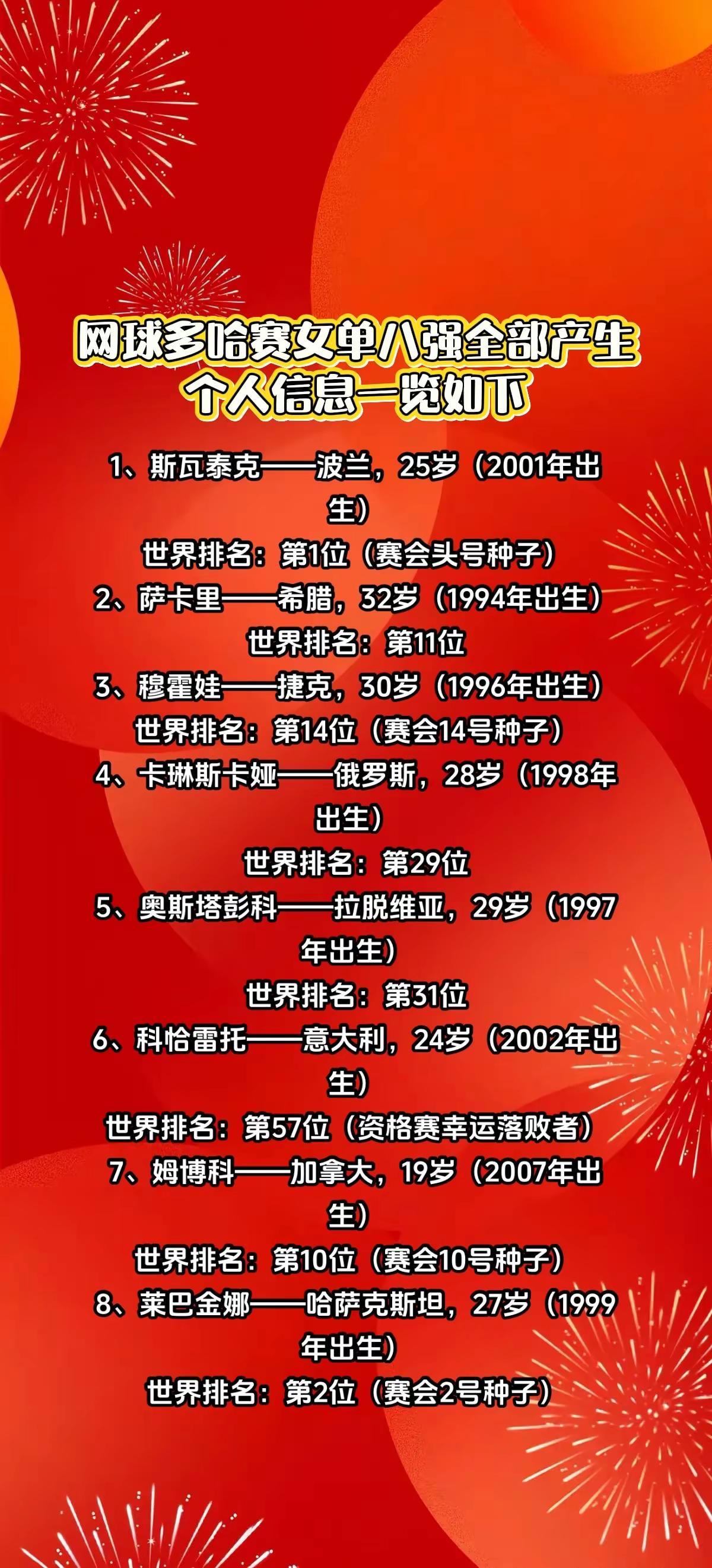 网球多哈赛女单八强全部产生,个人信息如下。网球