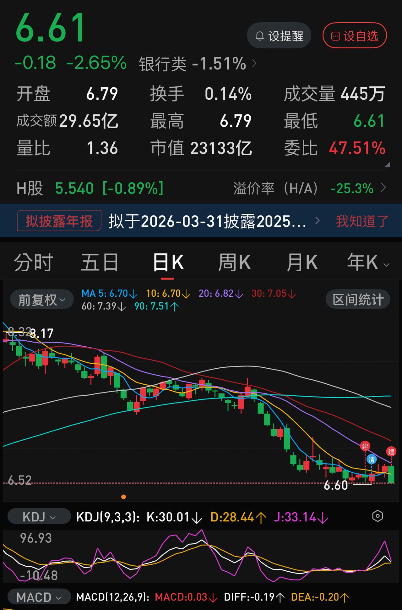 不信邪,今天上午继续挂单买农业银行,挂单时,农业银行已经下跌了1.5 %左右,在6.69元,直接挂了个6.61元的买单,抱着成交不成交无所谓的心态。 没想到在尾盘真的就成交了!在三大指数都红盘的情况下,农行引领银行板块再次大跌。 节前倒数第二个交易日,难道还要控指数? 从农业银行今天全天走势来看,真的是毫无抵抗啊!而且日K线有破位的趋势,不知明天能否止住趋势。